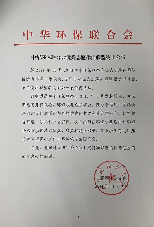中华环保联合会优秀志愿律师联盟终止公告