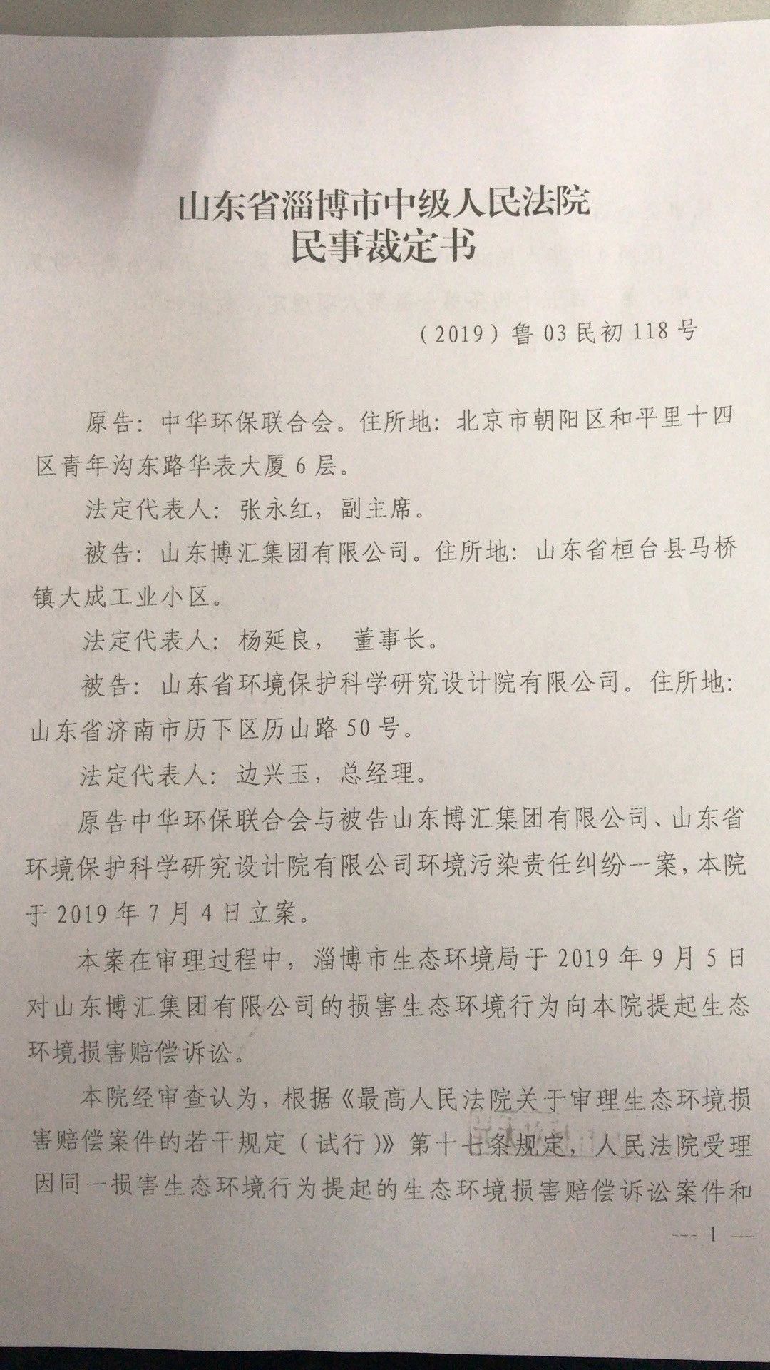 近日,我会收到淄博市中院出具的民事裁定书,以淄博市生态环境局已对博汇集团、辰龙纸业分别提起了生态环境损害赔偿诉讼为由,裁定我会上述两起公益诉讼案件中止诉讼。