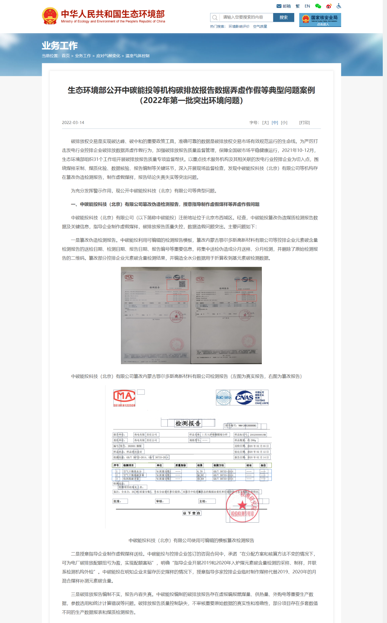 2022年3月14日,生态环境部将中碳能投科技(北京)有限公司碳排放报告数据弄虚作假列为2022年第一批突出环境问题并予以公布,中央电视台也对此作出了专门报道。