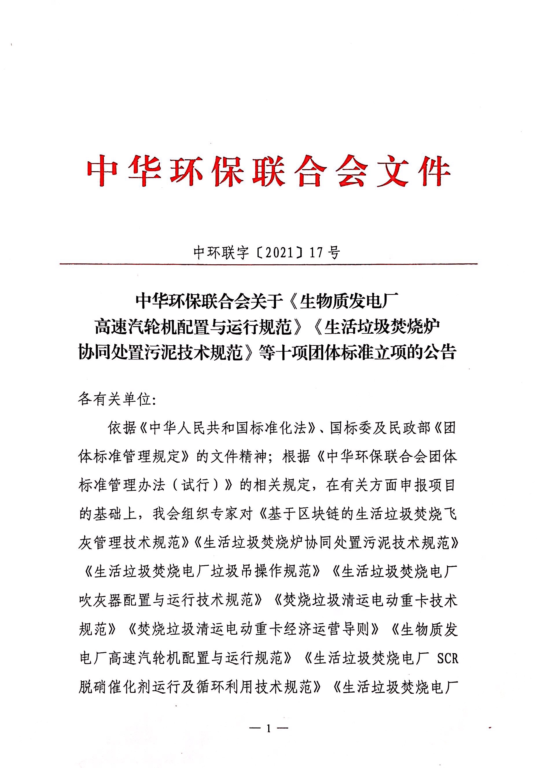 关于《生物质发电厂高速汽轮机配置与运行规范》 《生活垃圾焚烧炉协同处置污泥技术规范》等十项团体标准立项的公告