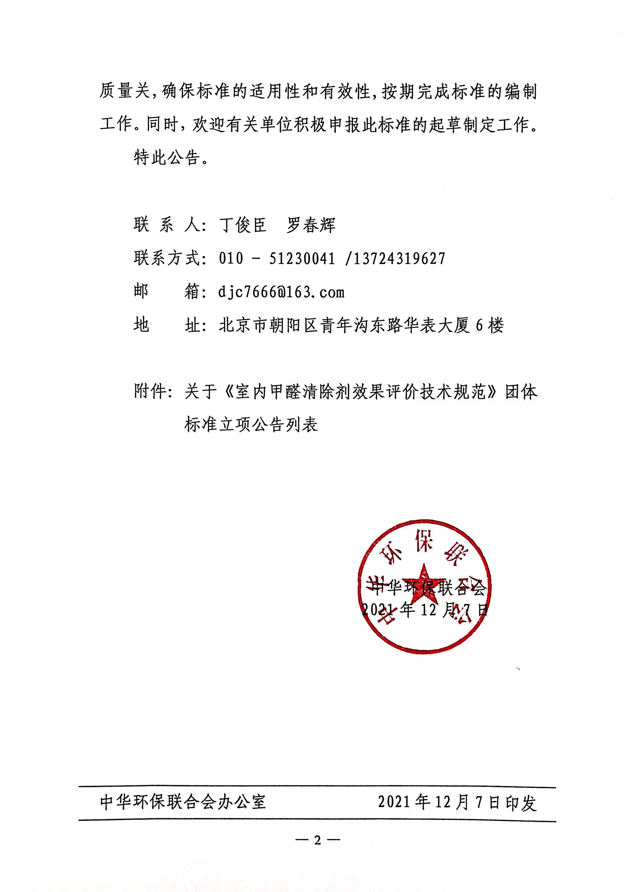 关于《室内甲醛清除剂效果评价技术规范》团体标准立项的公告
