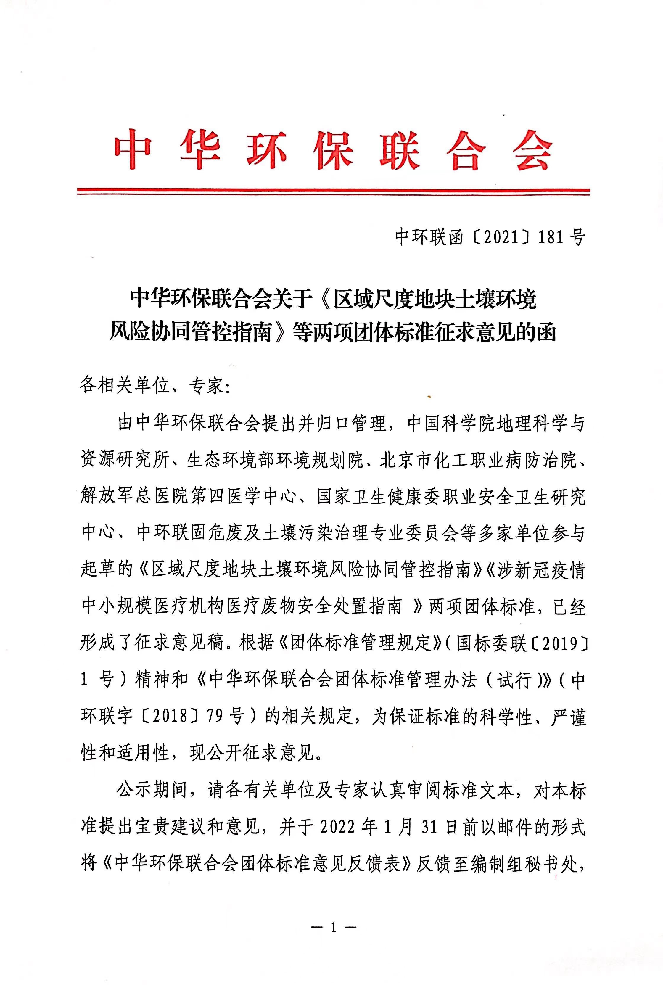 关于《区域尺度地块土壤环境风险协同管控指南》等两项团体标准征求意见的函