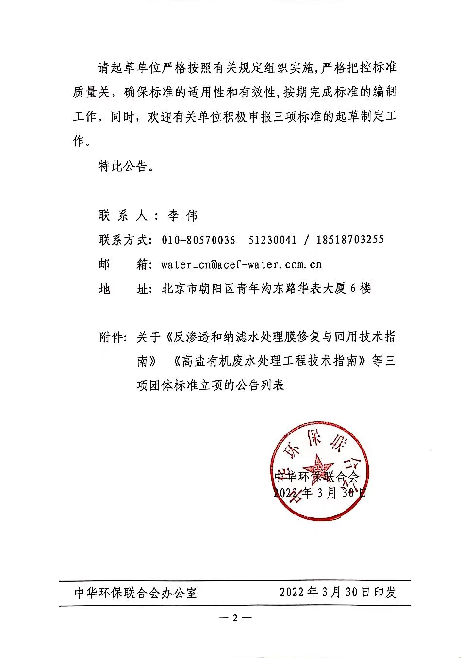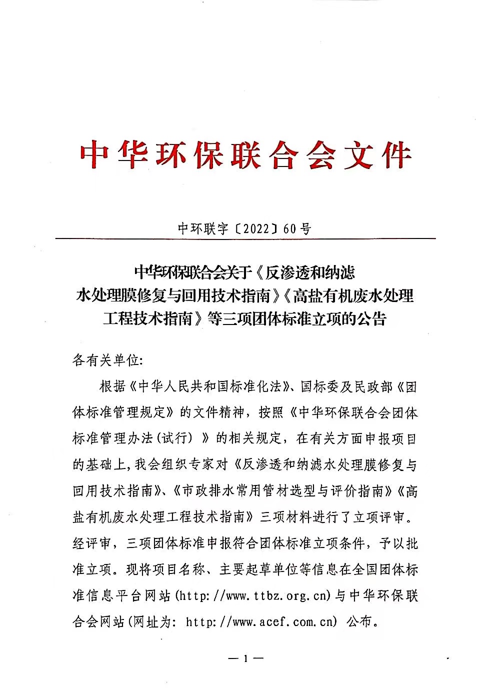 关于《反渗透和纳滤水处理膜修复与回用技术指南》《高盐有机废水处理工程技术指南》等 三项团体标准立项的公告