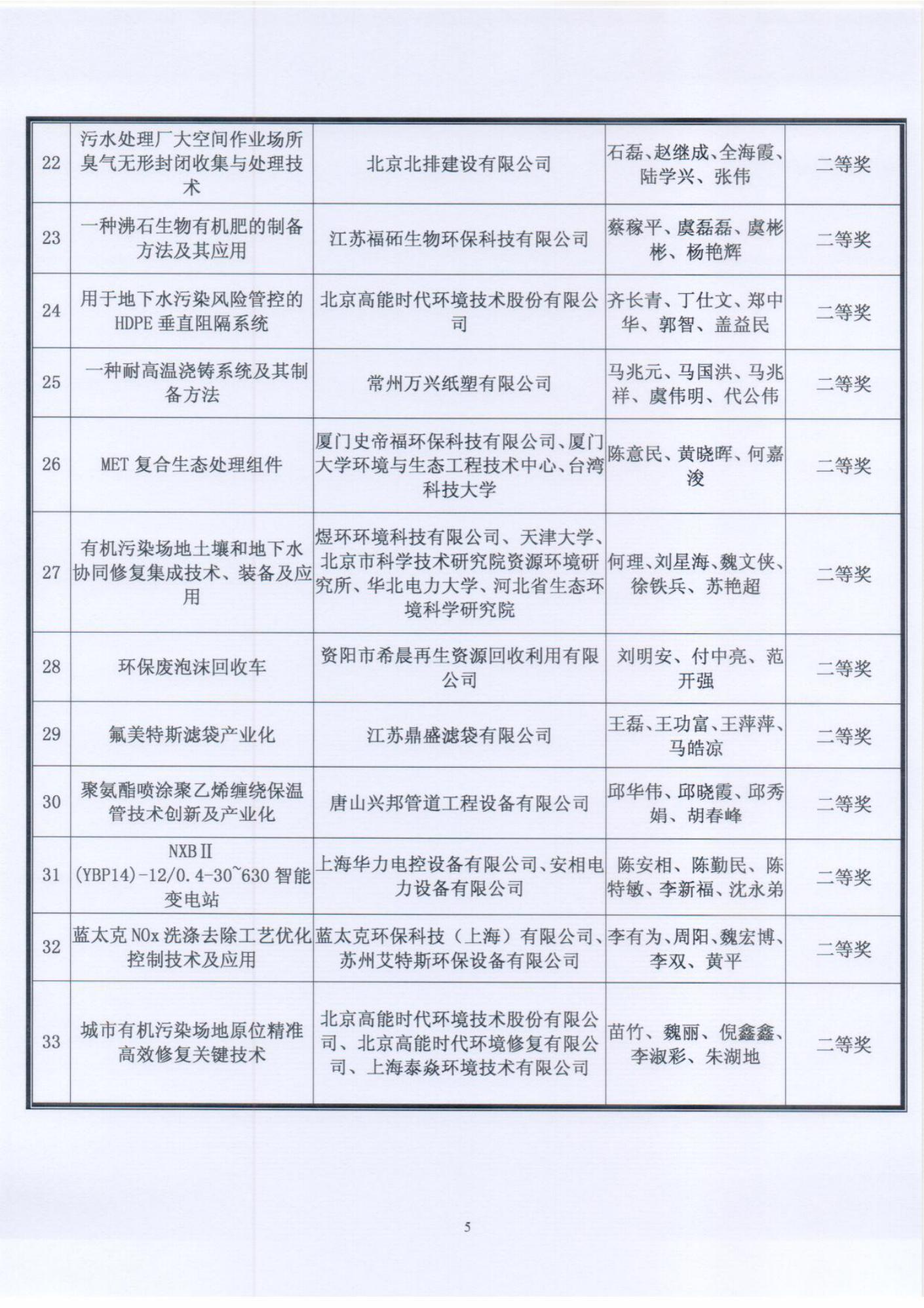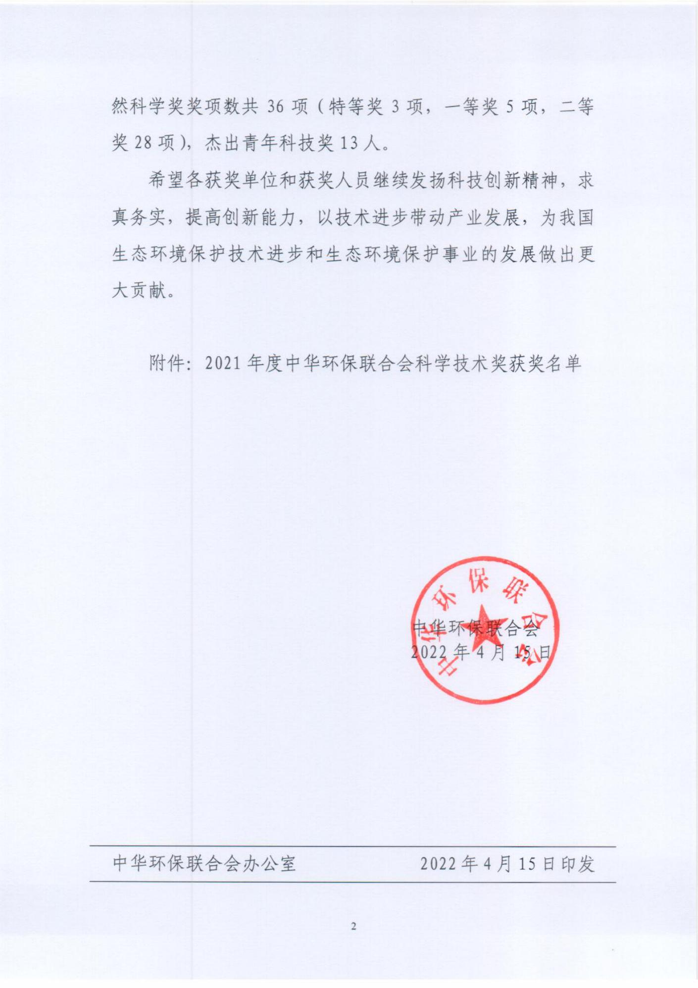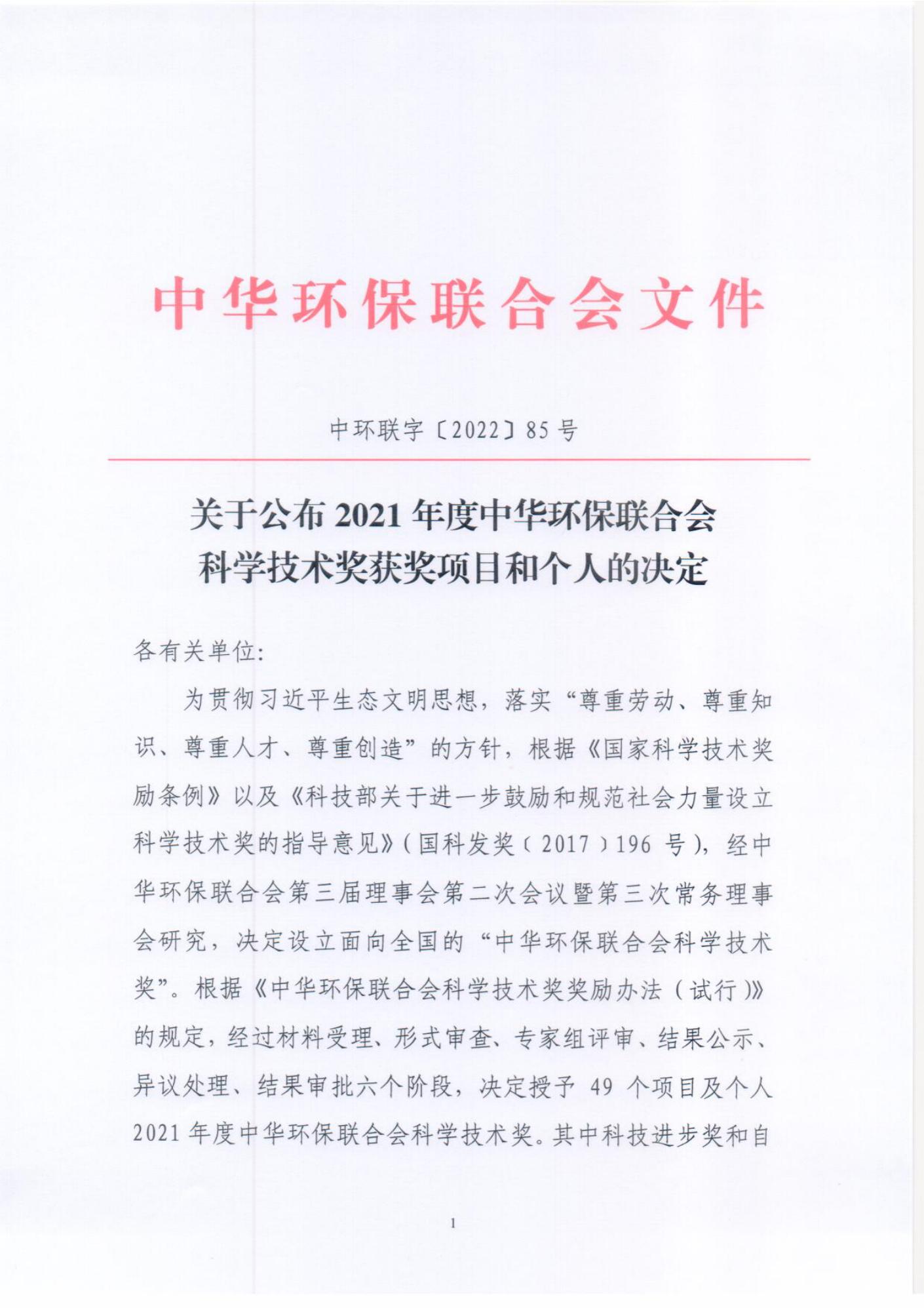 关于公布2021年度中华环保联合会科学技术奖获奖项目和个人的决定