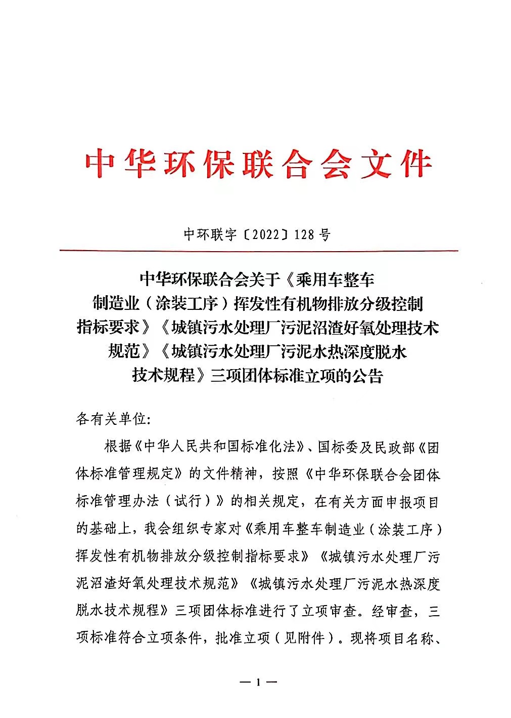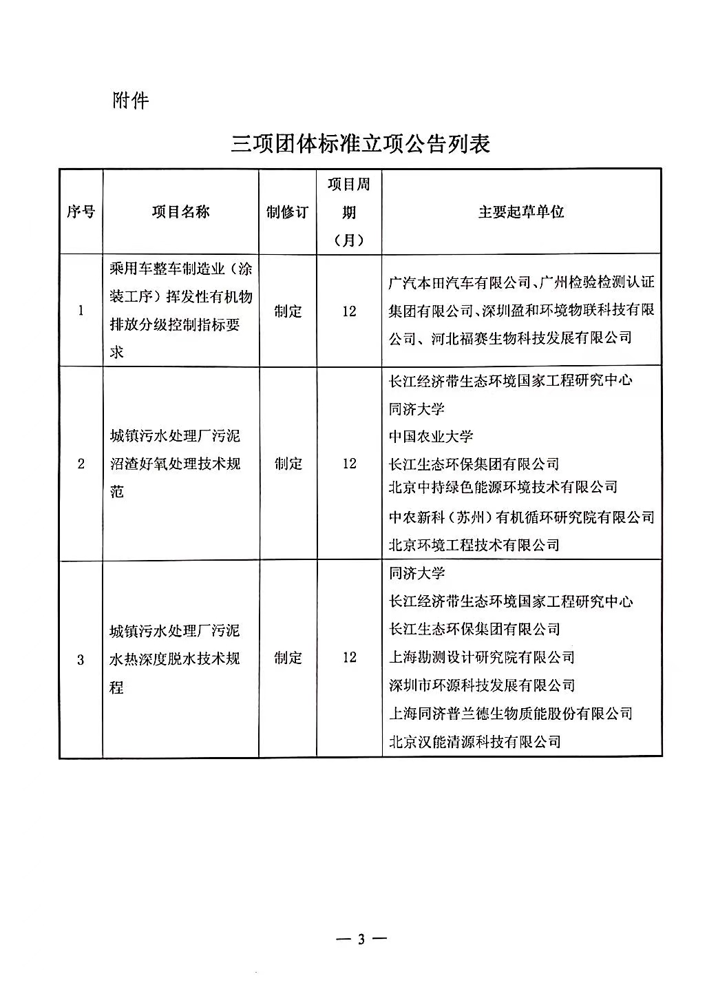 关于《乘用车整车制造业(涂装工序)挥发性有机物排放分级控制指标要求》《城镇污水处理厂污泥沼渣好氧处理技术规范》《城镇污水处理厂污泥水热深度脱水技术规程》三项团体标准的公告