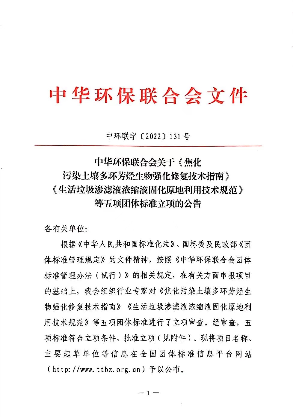 中华环保联合会关于《焦化污染土壤多环芳烃生物强化修复技术指南》《生活垃圾渗滤液浓缩液固化原地利用技术规范》等五项团体标准立项的公告