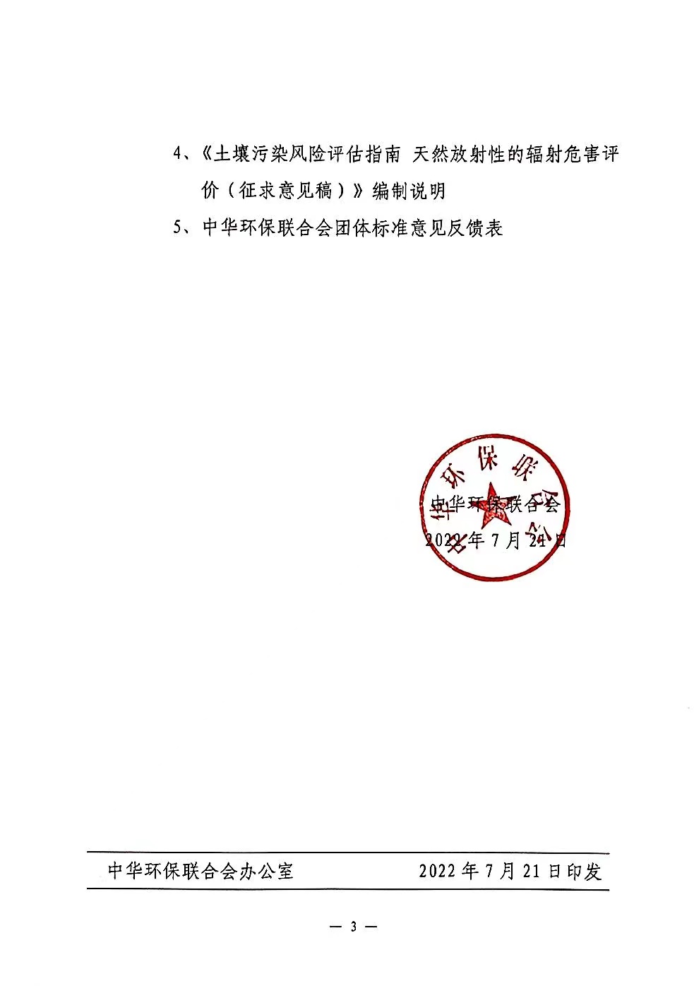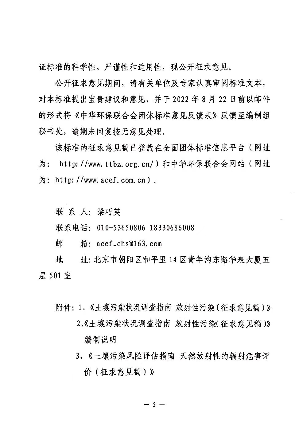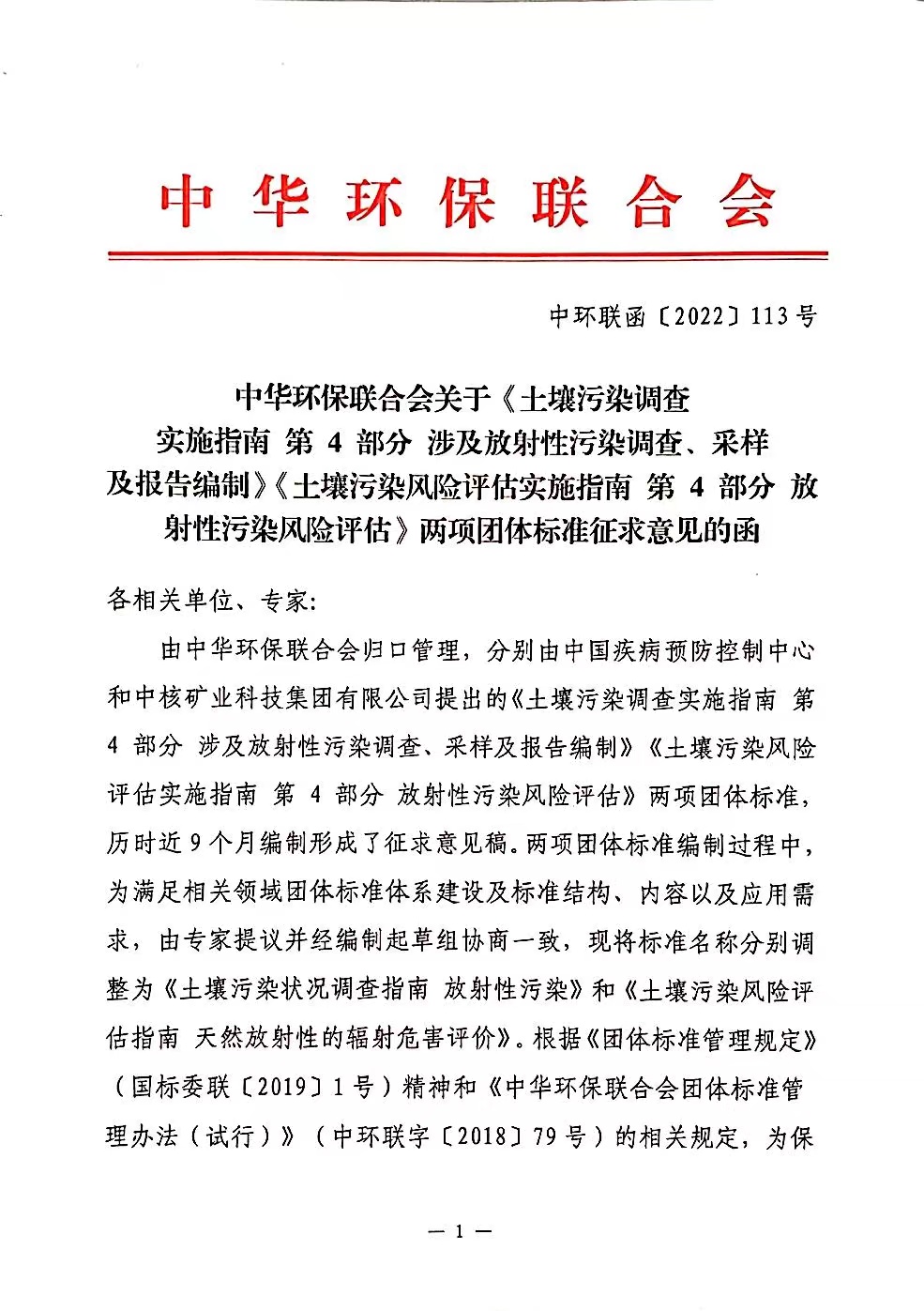 中华环保联合会关于《土壤污染调查实施指南 第 4 部分 涉及放射性污染调查、采样及报告编制》《土壤污染风险评估实施指南 第 4 部分 放射性污染风险评估》两项团体标准征求意见的函