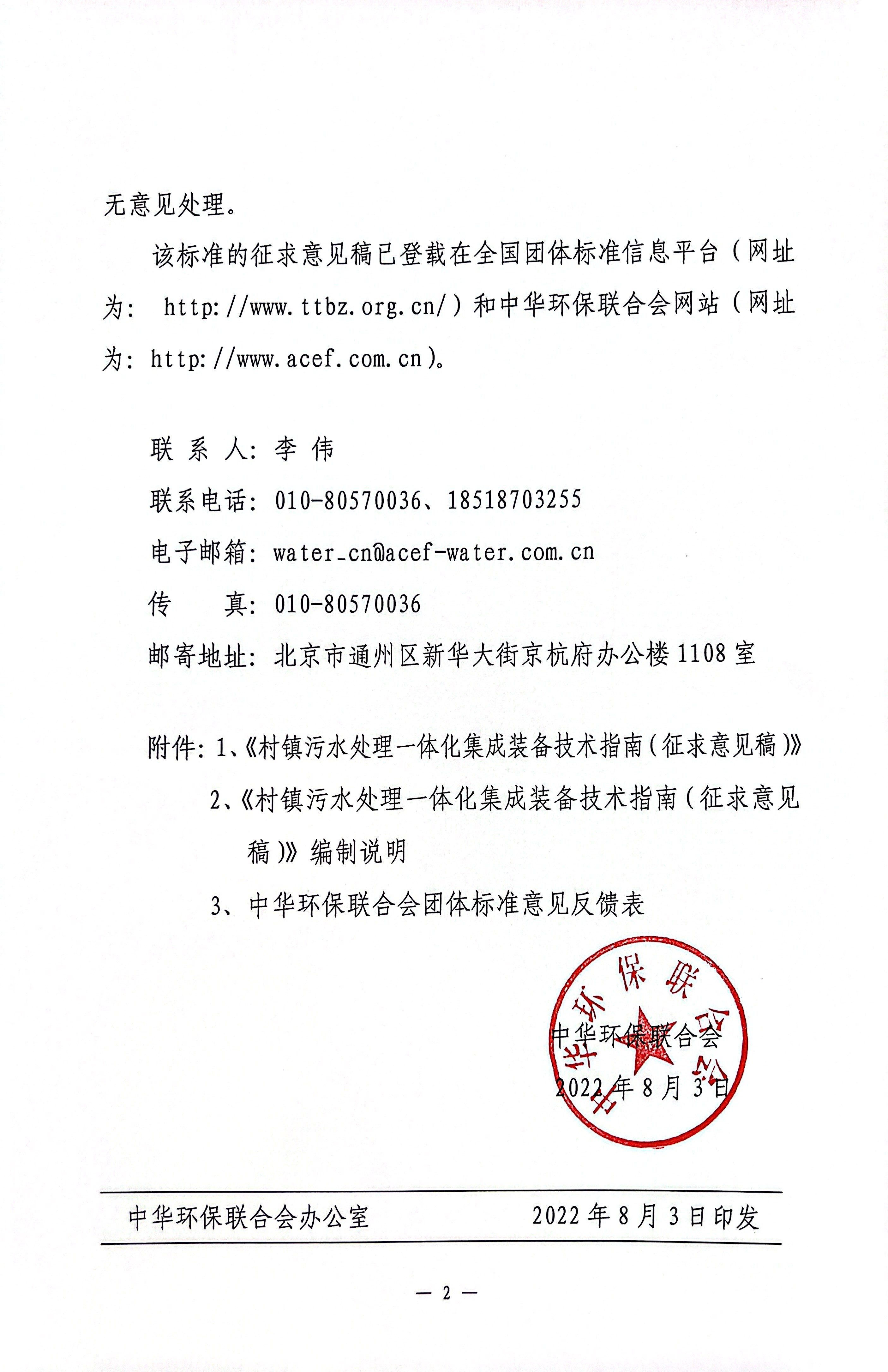 关于《村镇污水处理一体化集成装备技术指南》 团体标准征求意见的函