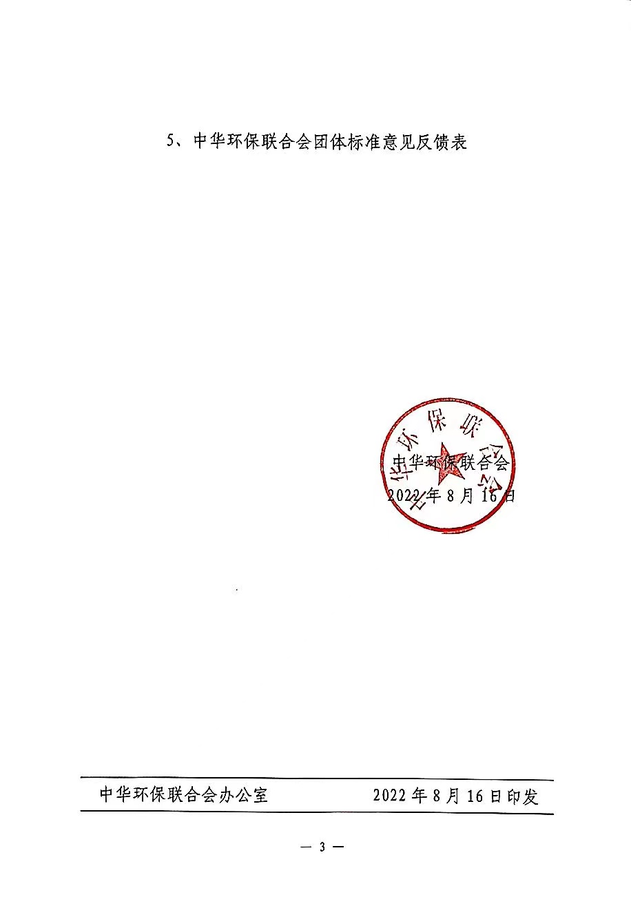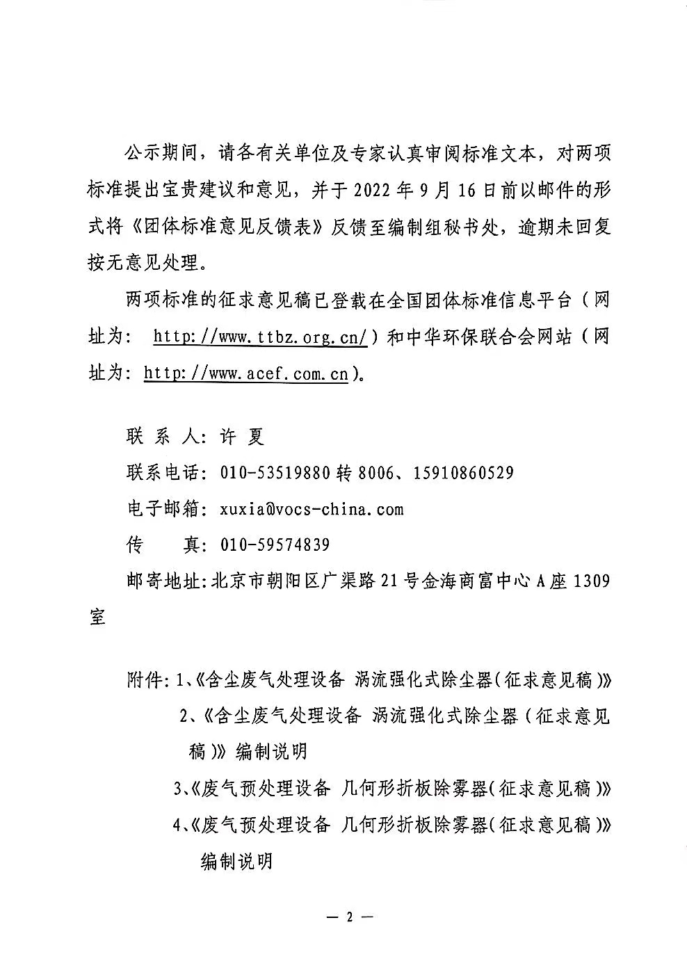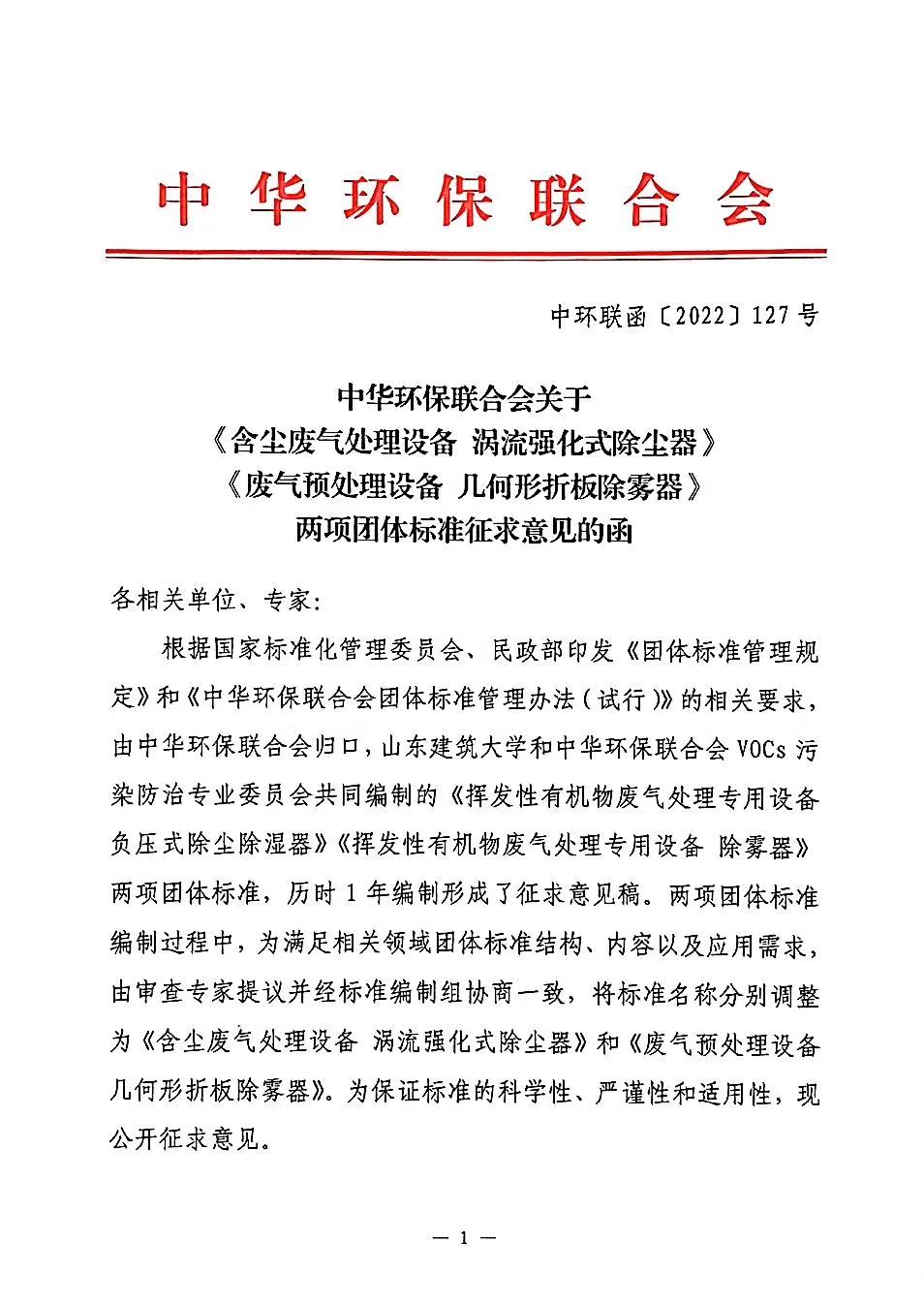 中华环保联合会关于《含尘废气处理设备 涡流强化式除尘器》《废气预处理设备 几何形折板除雾器》两项团体标准征求意见的函