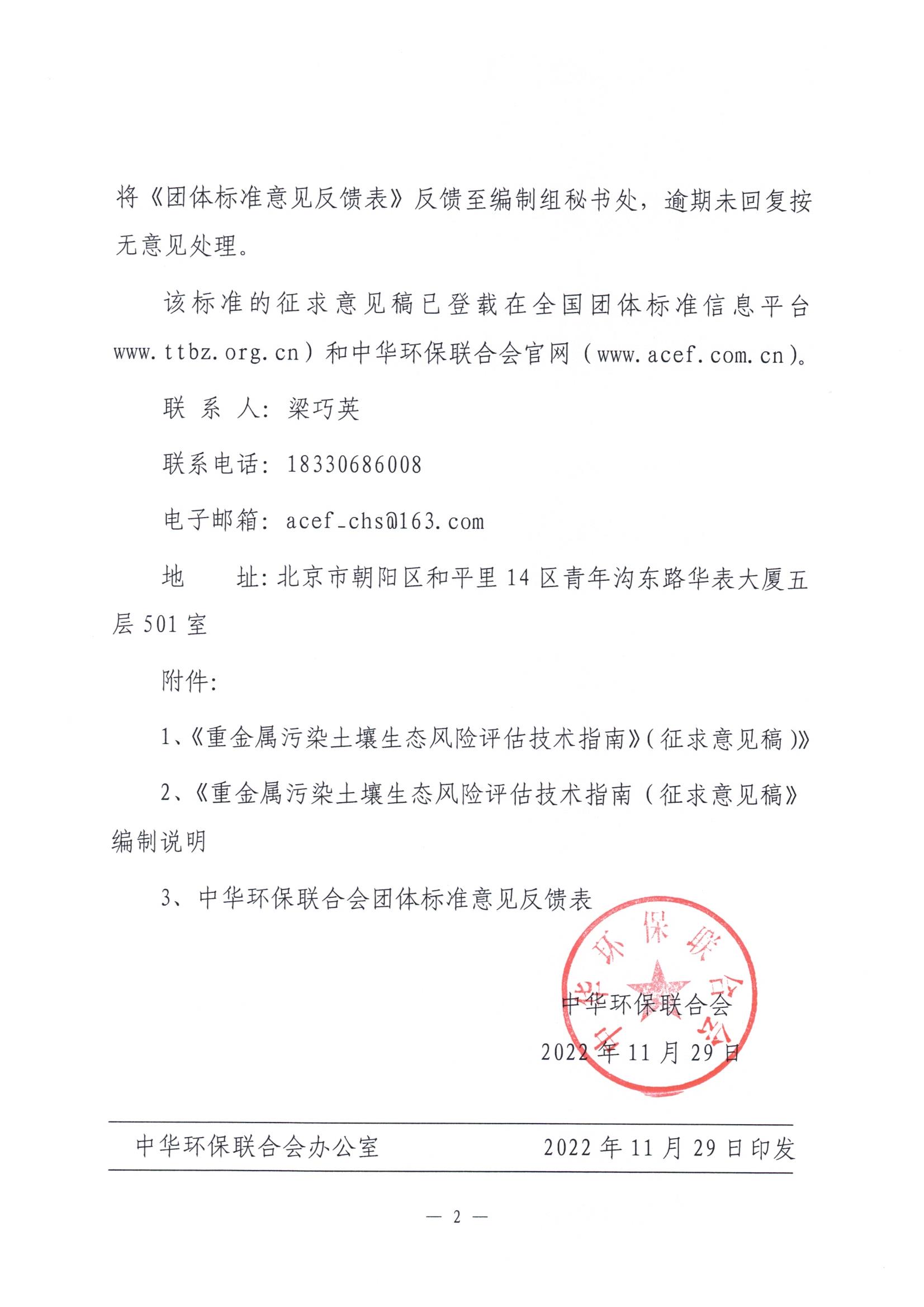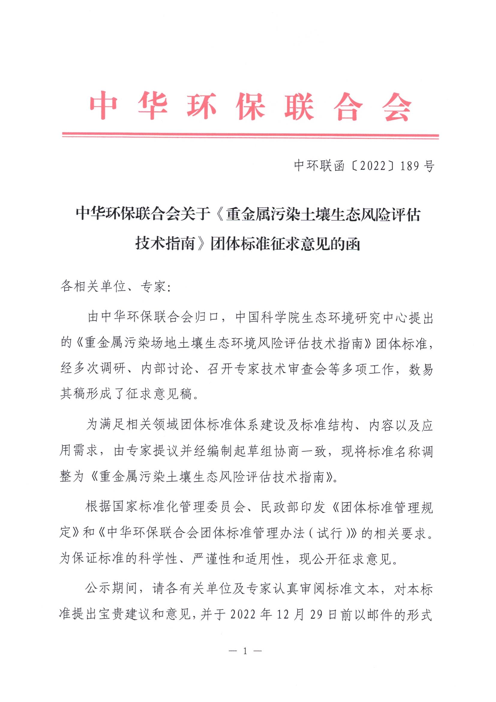 关于《重金属污染土壤生态风险评估技术指南》团体标准征求意见的函
