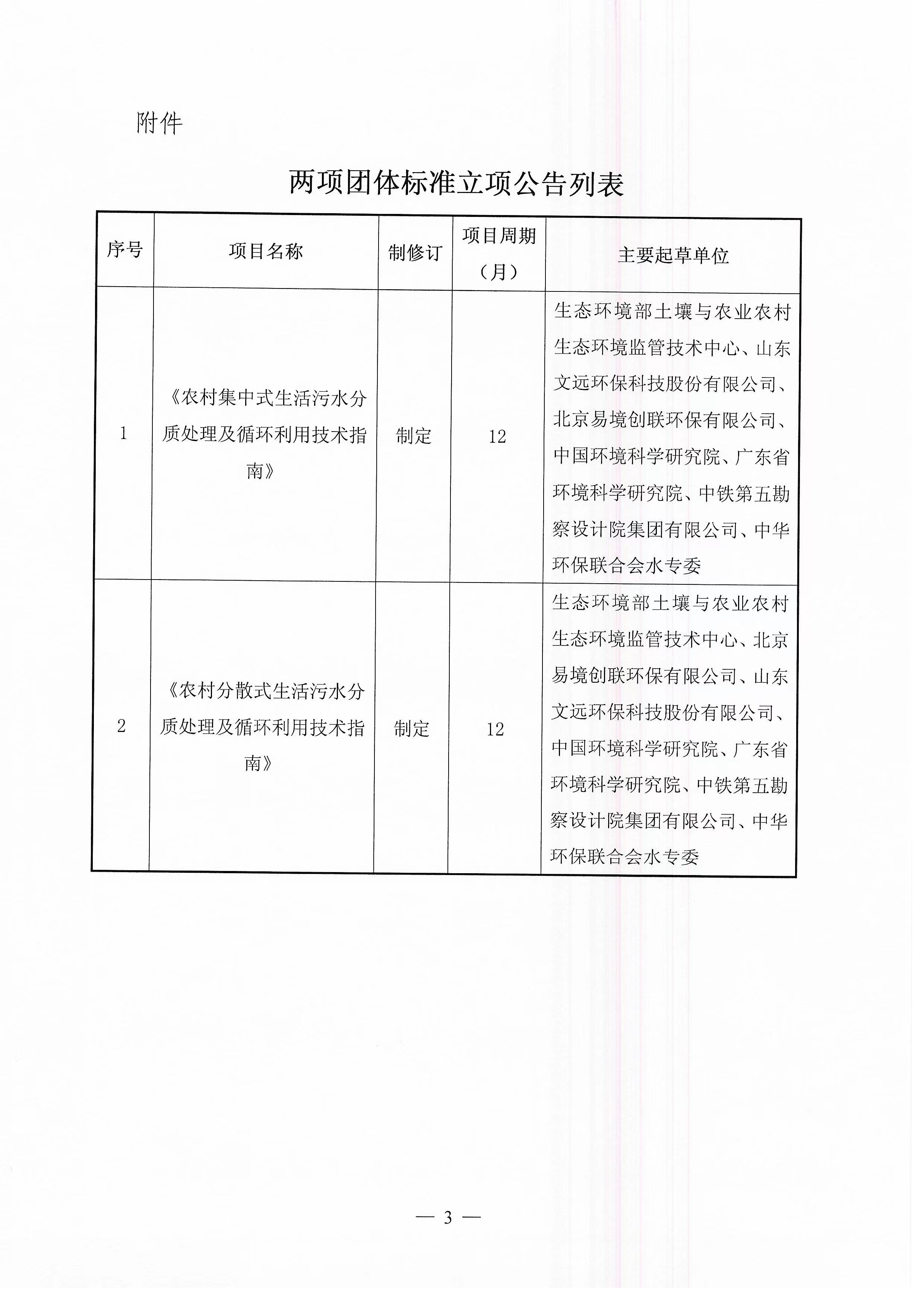 关于《农村集中式生活污水分质处理及循环利用技术指南》等两项团体标准立项的公告