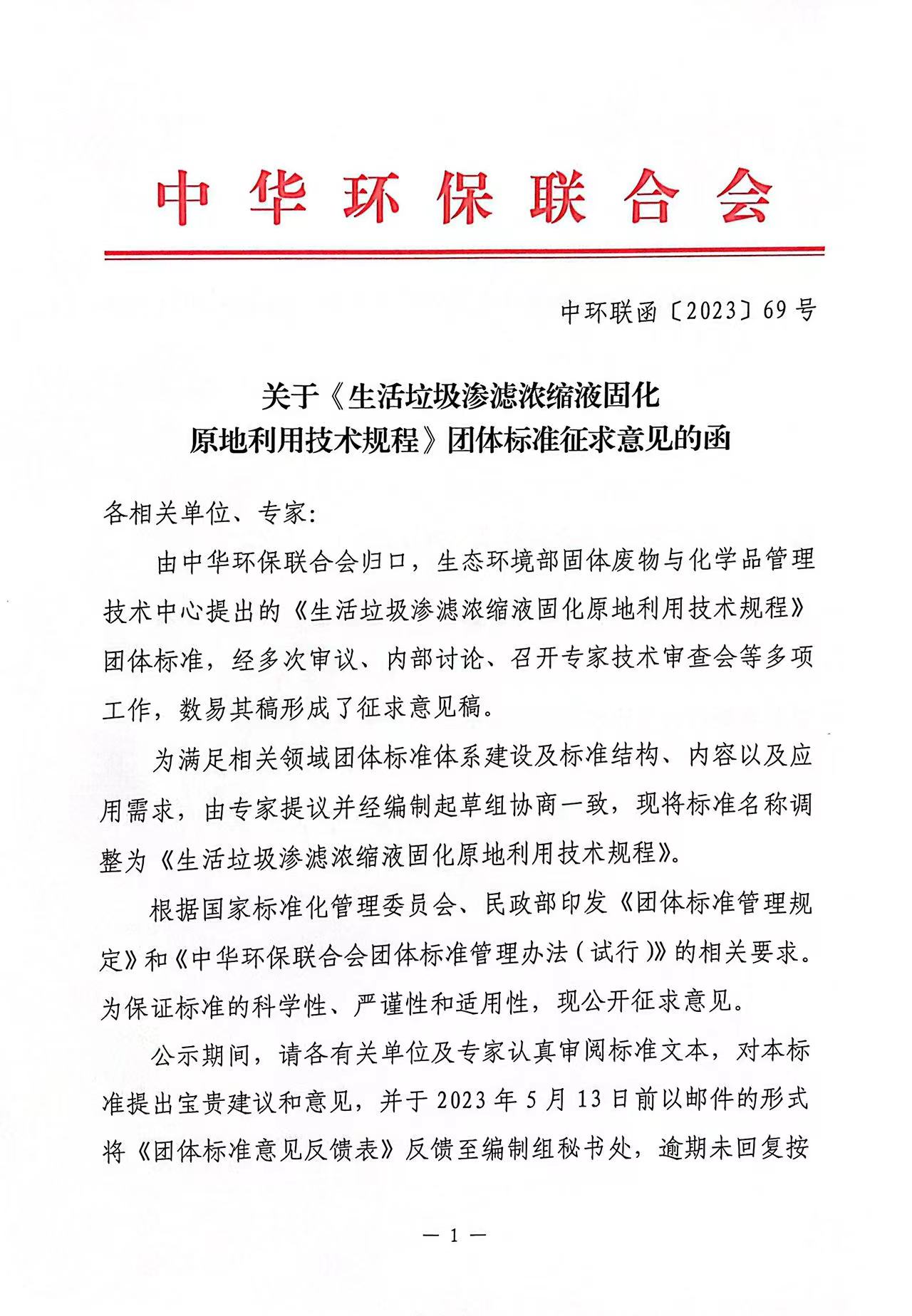关于《生活垃圾渗滤浓缩液固化原地利用技术规程》团体标准征求意见的函