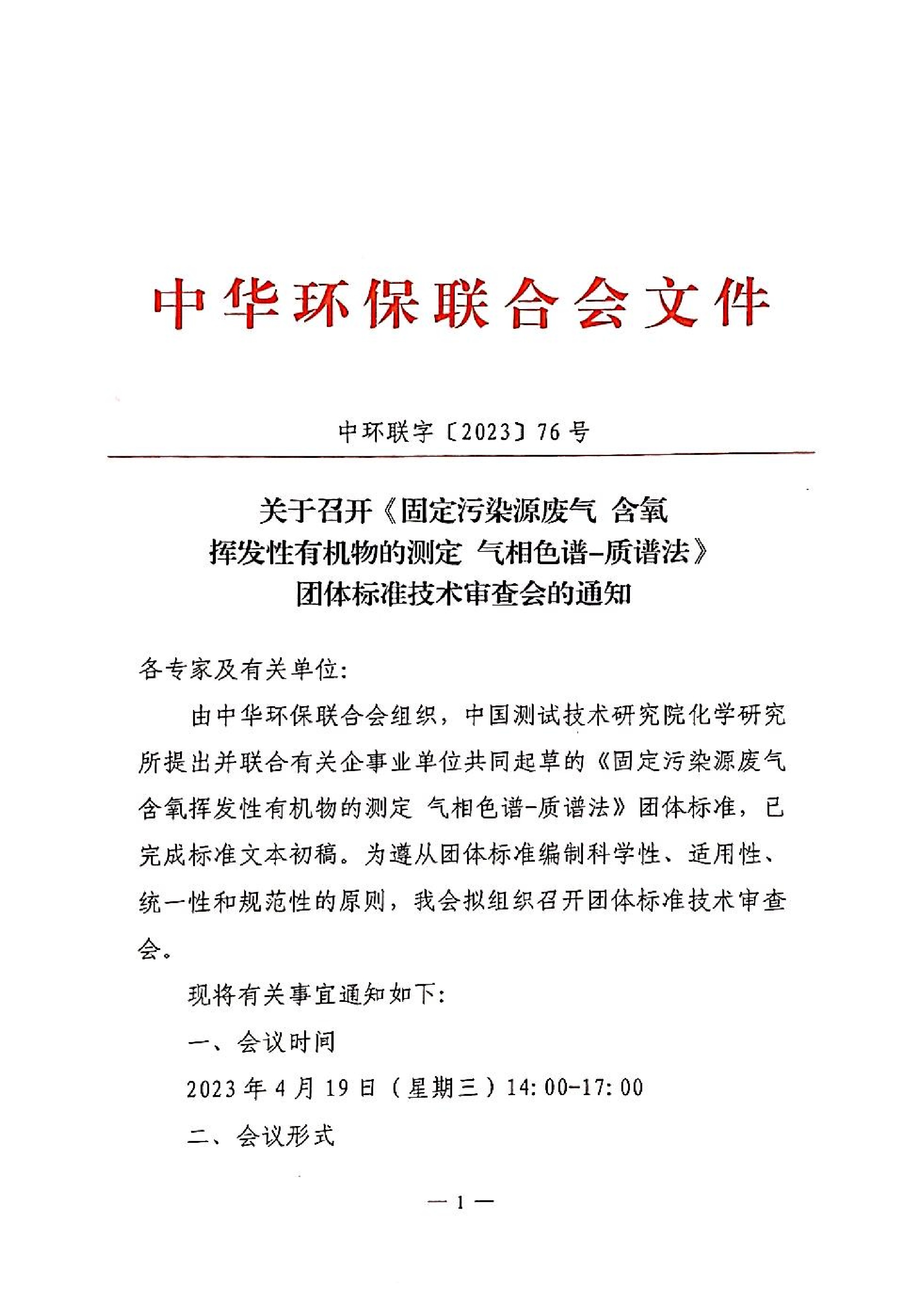 关于召开 《固定污染源废气 含氧挥发性有机物的测定 气相色谱-质谱法》团体标准技术审查会的通知