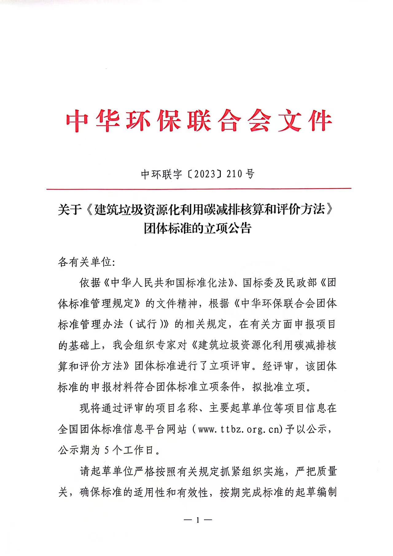 关于《建筑垃圾资源化利用碳减排核算和评价方法》团体标准的立项公告