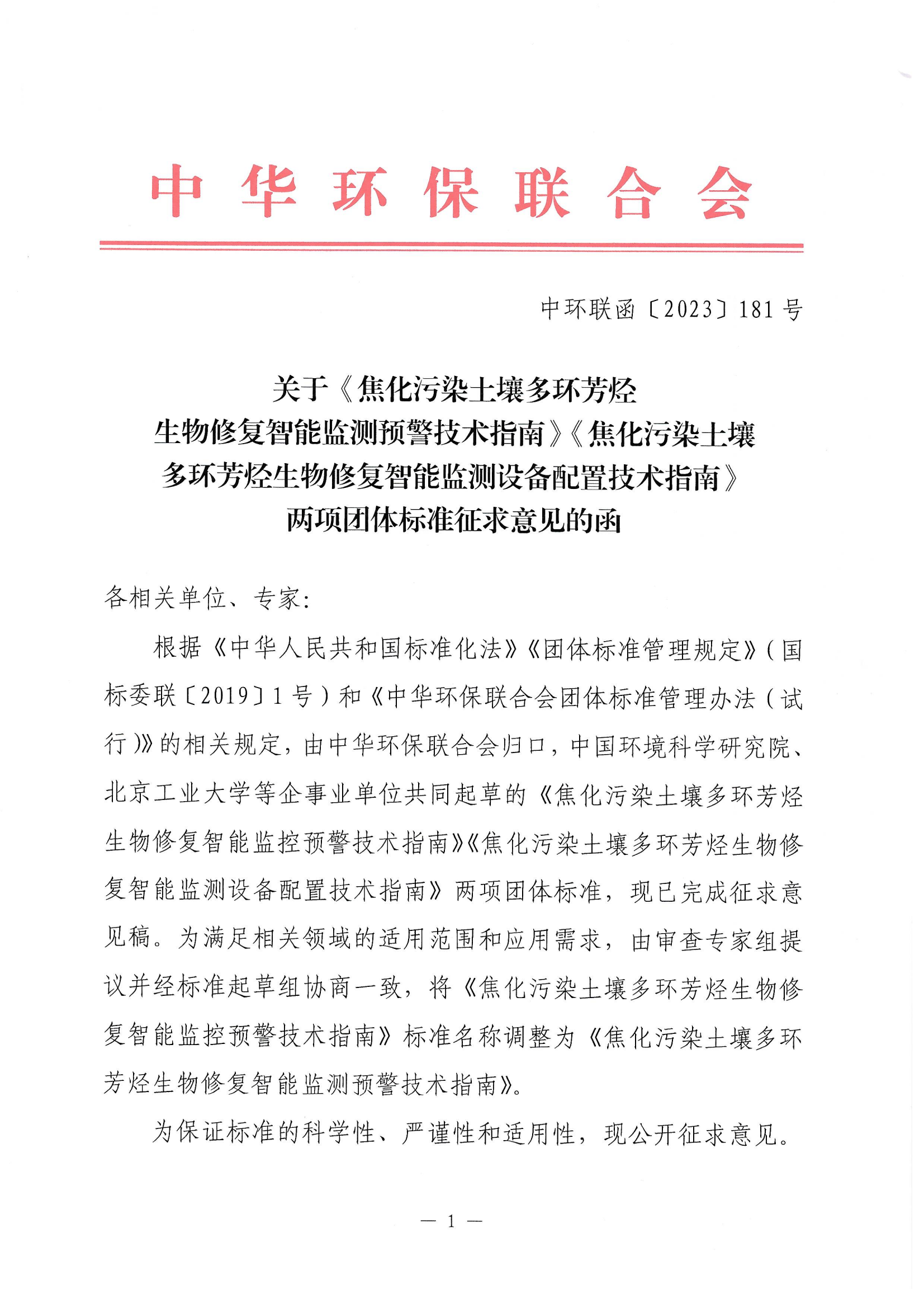关于《焦化污染土壤多环芳烃生物修复智能监测预警技术指南》《焦化污染土壤多环芳烃生物修复智能监测设备配置技术指南》两项团体标准征求意见的函