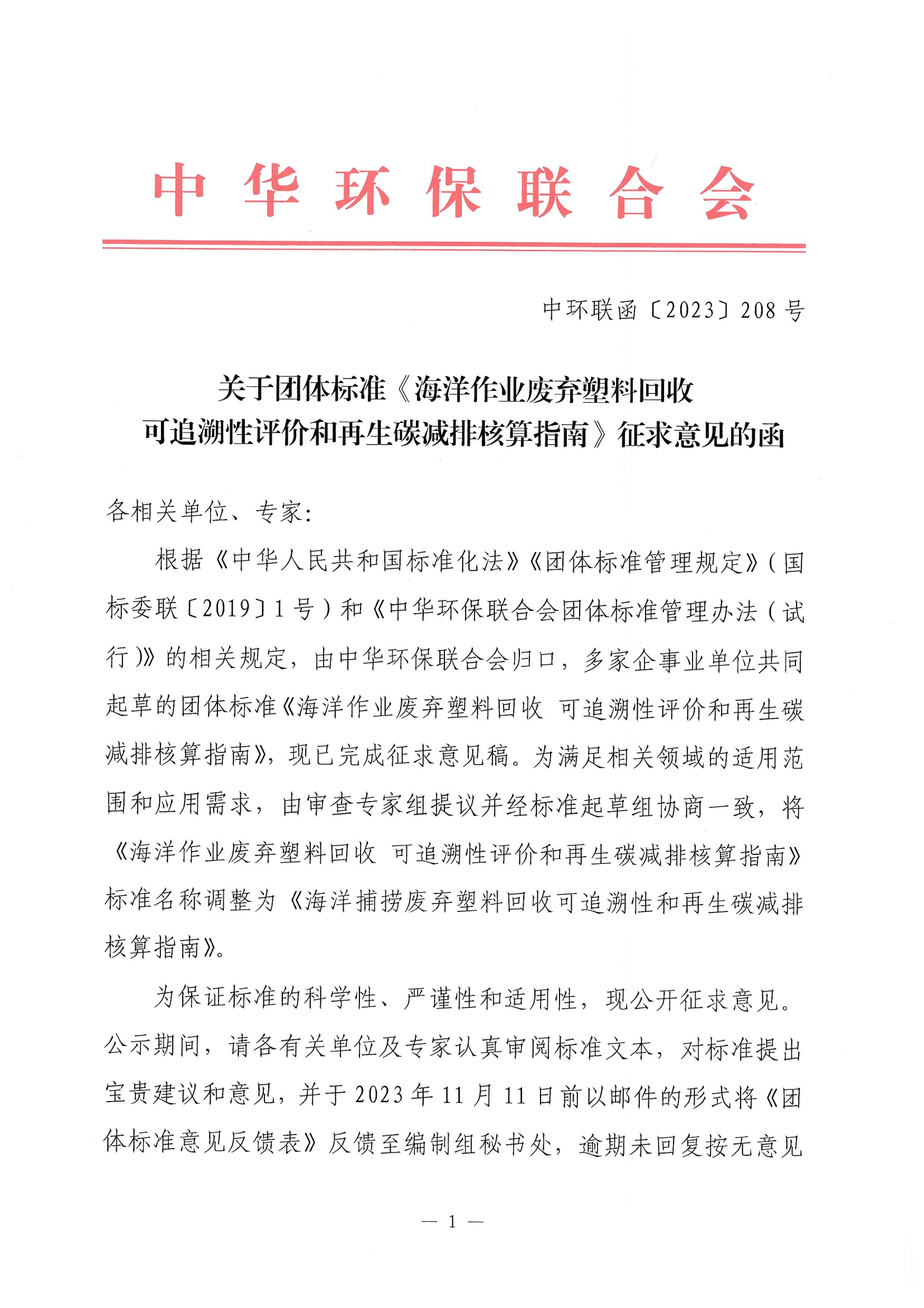 关于团体标准《海洋作业废弃塑料回收 可追溯性评价和再生碳减排核算指南》征求意见的函