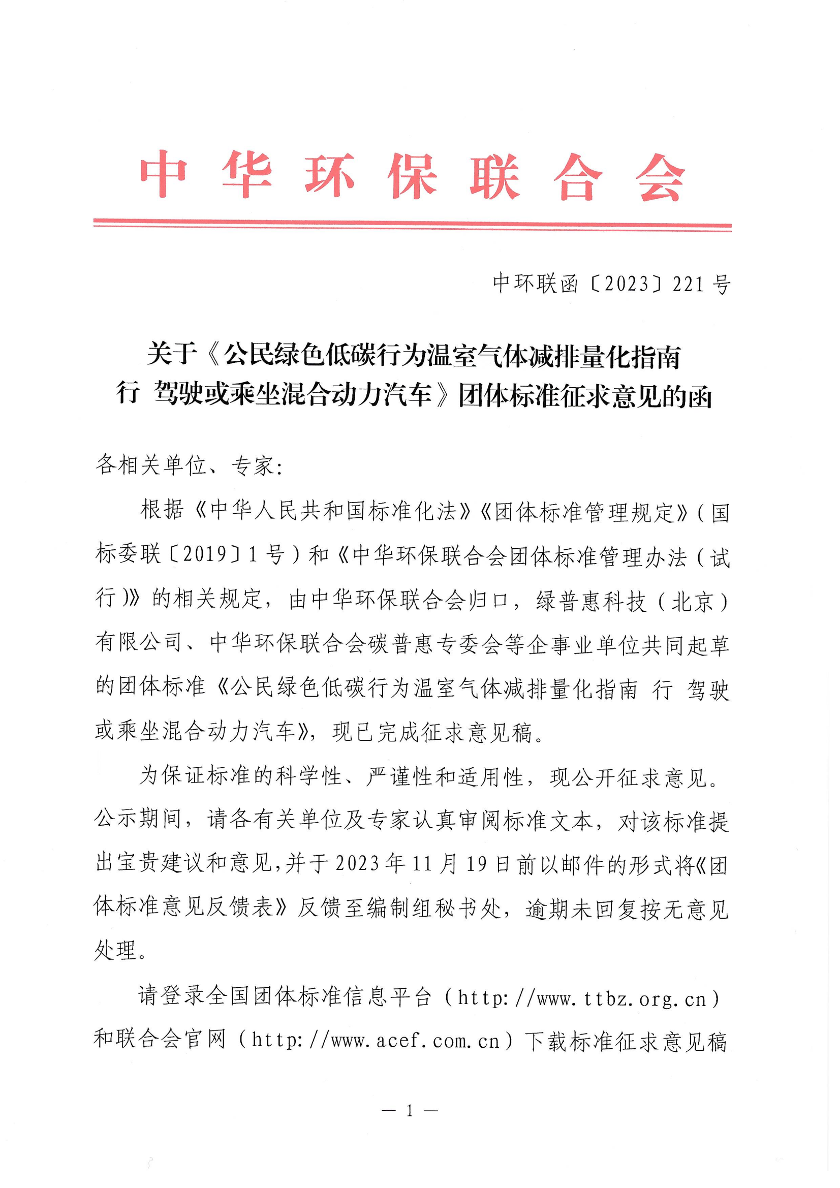 关于《公民绿色低碳行为温室气体减排量化指南 行 驾驶或乘坐混合动力汽车》团体标准 征求意见的函
