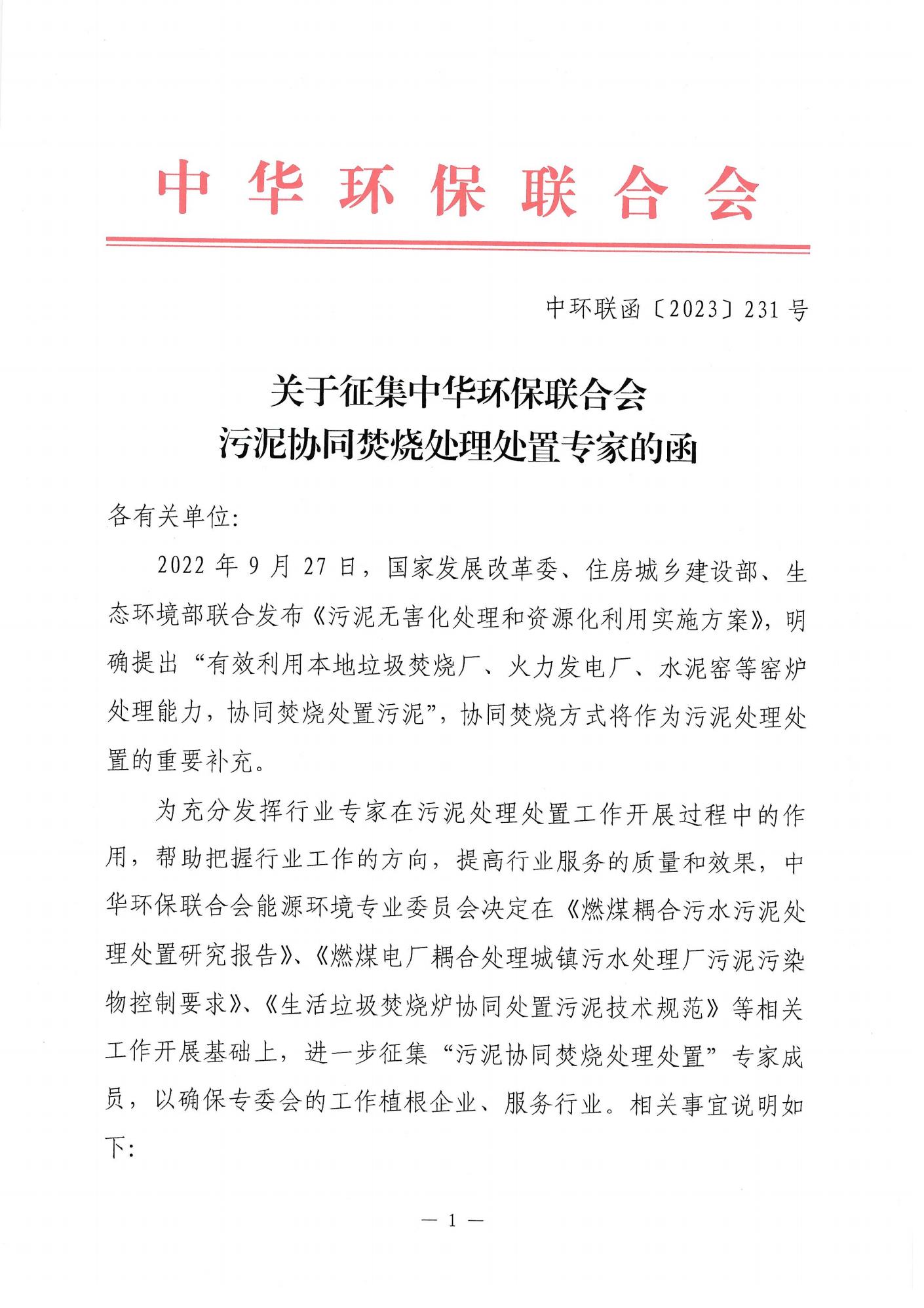 关于征集中华环保联合会污泥协同焚烧处理处置专家的函