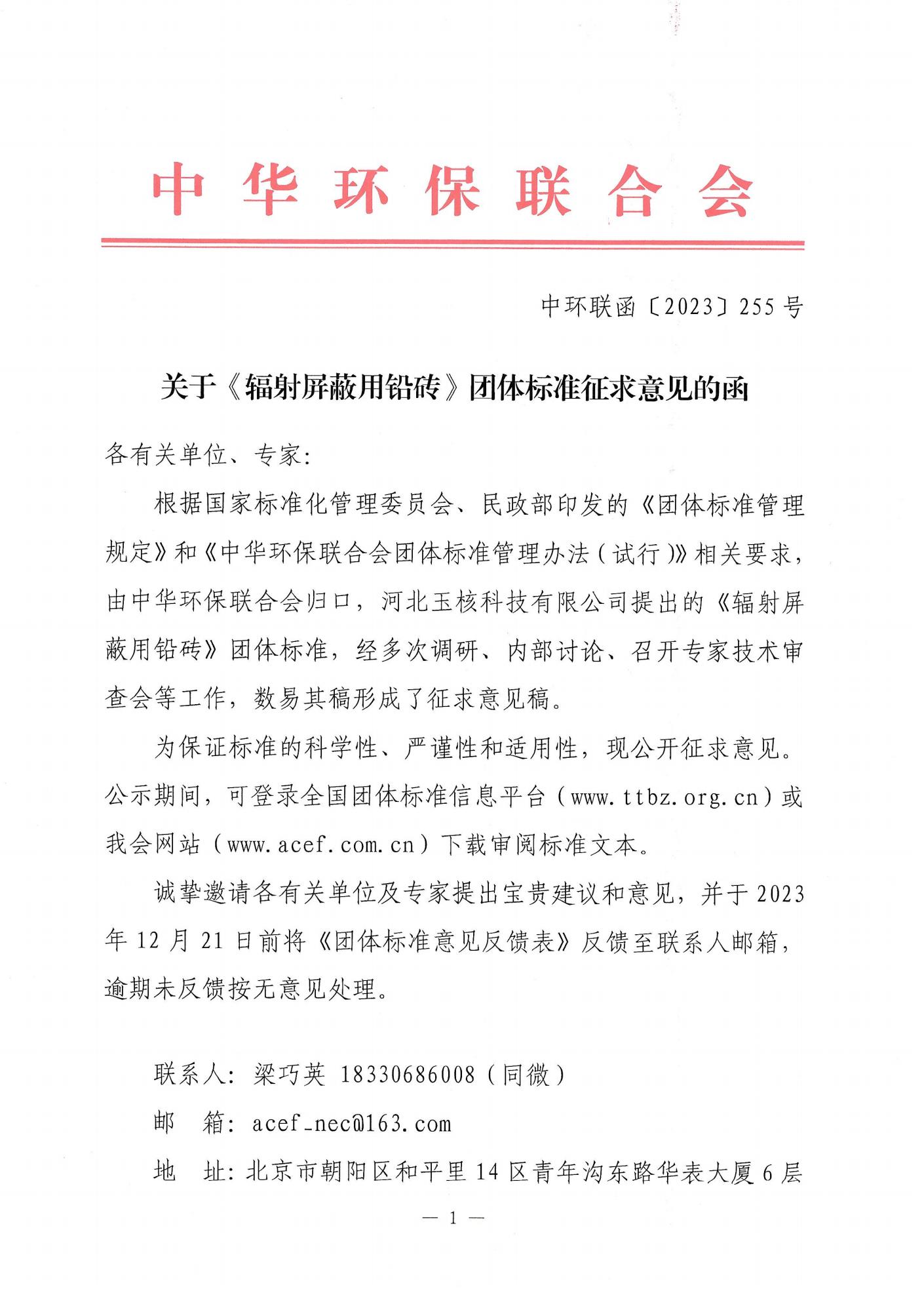 关于《辐射屏蔽用铅砖》团体标准征求意见的函