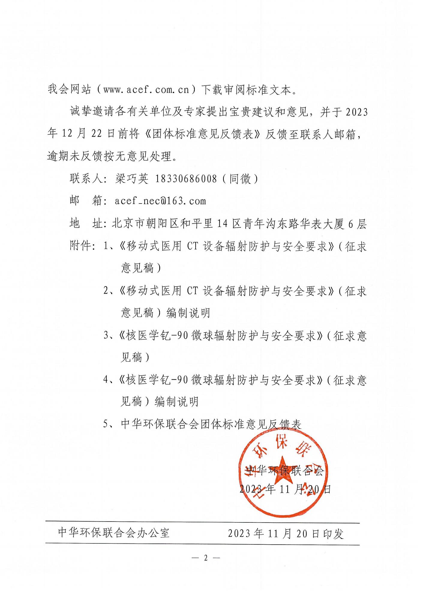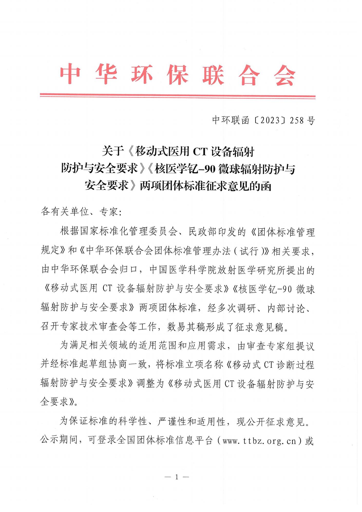 关于《移动式医用CT设备辐射防护与安全要求》《核医学钇-90微球辐射防护与安全要求》两项团体标准征求意见的函