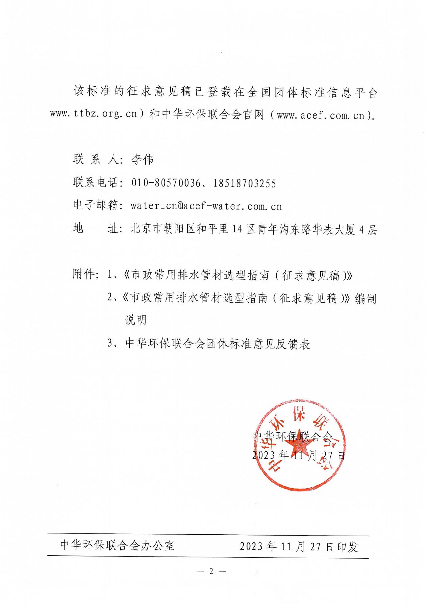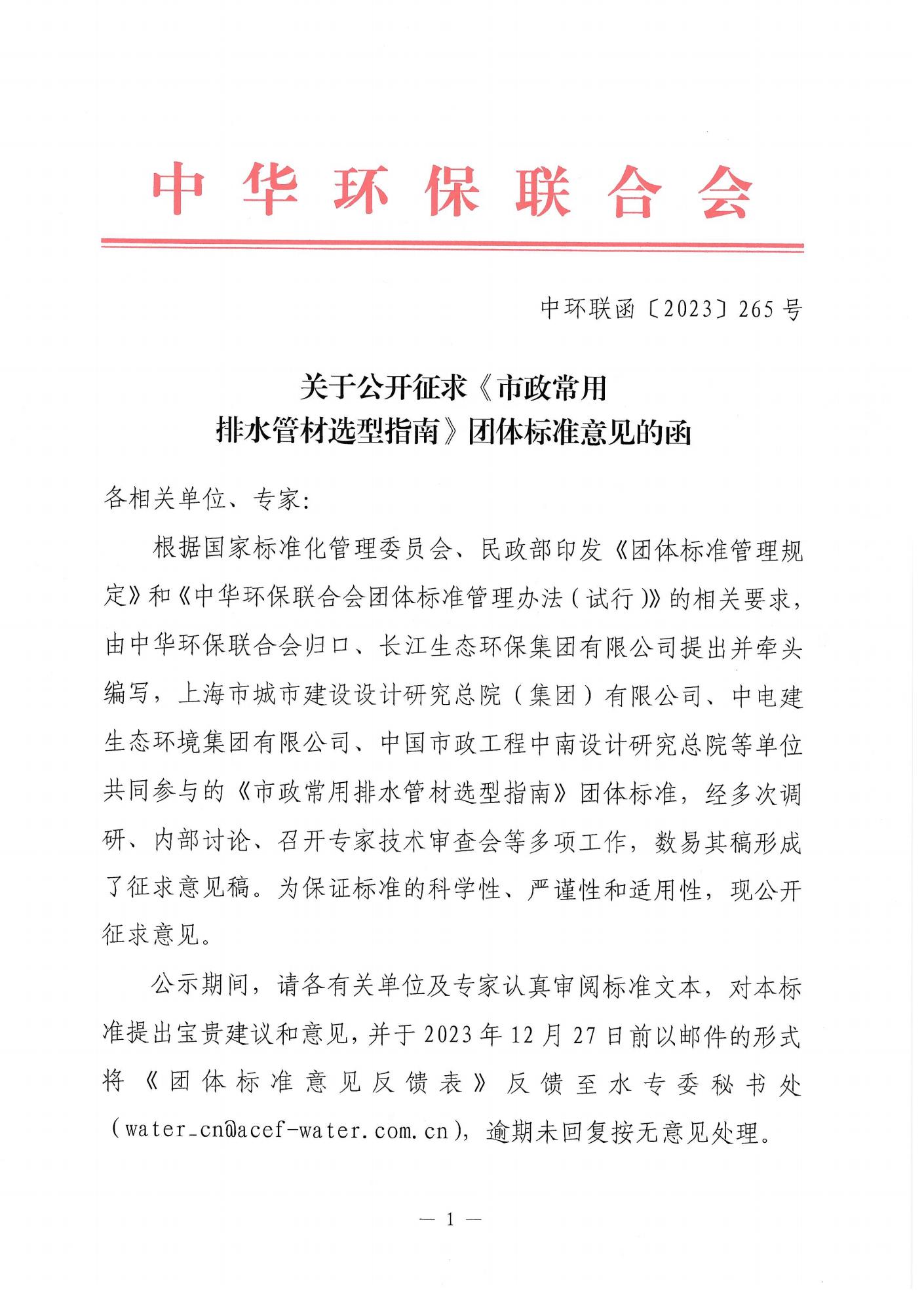 中华环保联合会关于公开征求《市政常用排水管材选型指南》团体标准意见的函