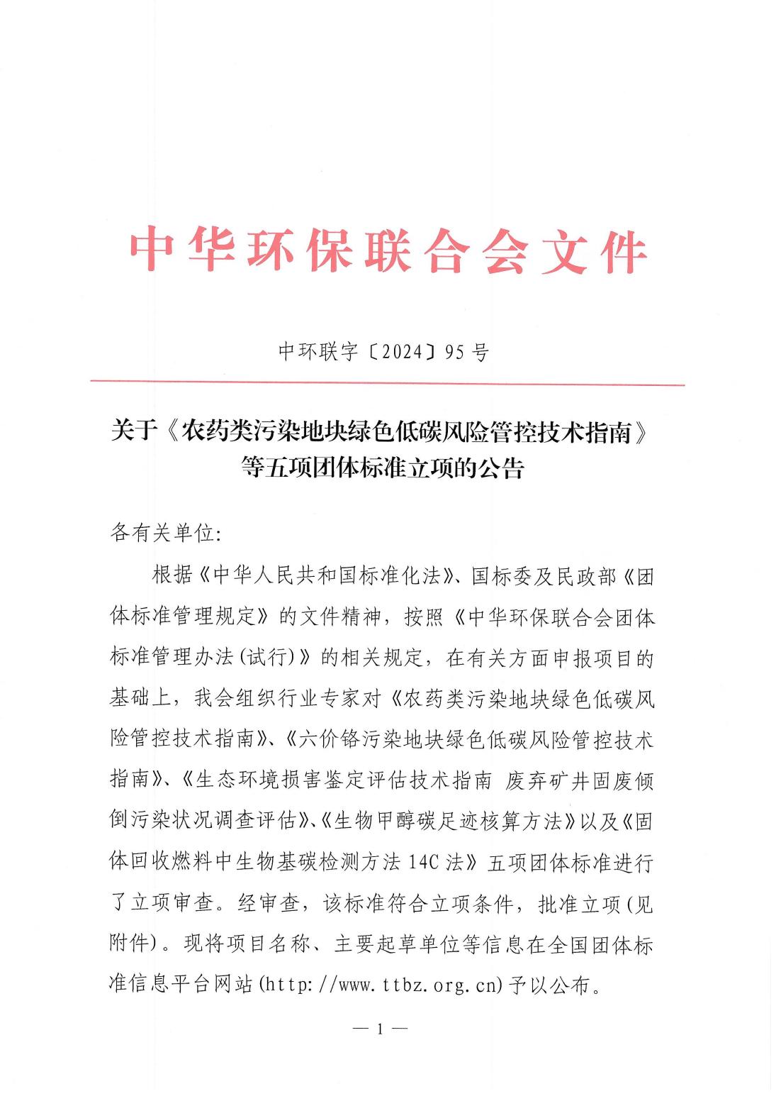 关于《农药类污染地块绿色低碳风险管控技术指南》等五项团体标准立项的公告
