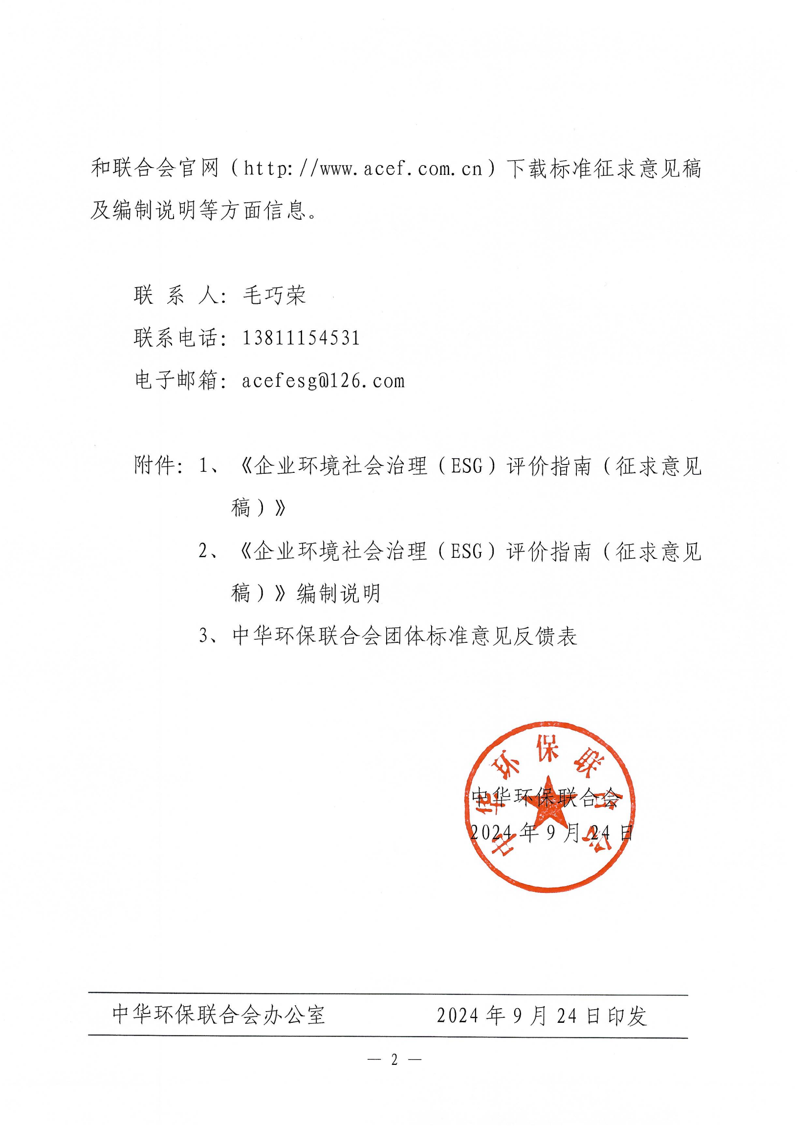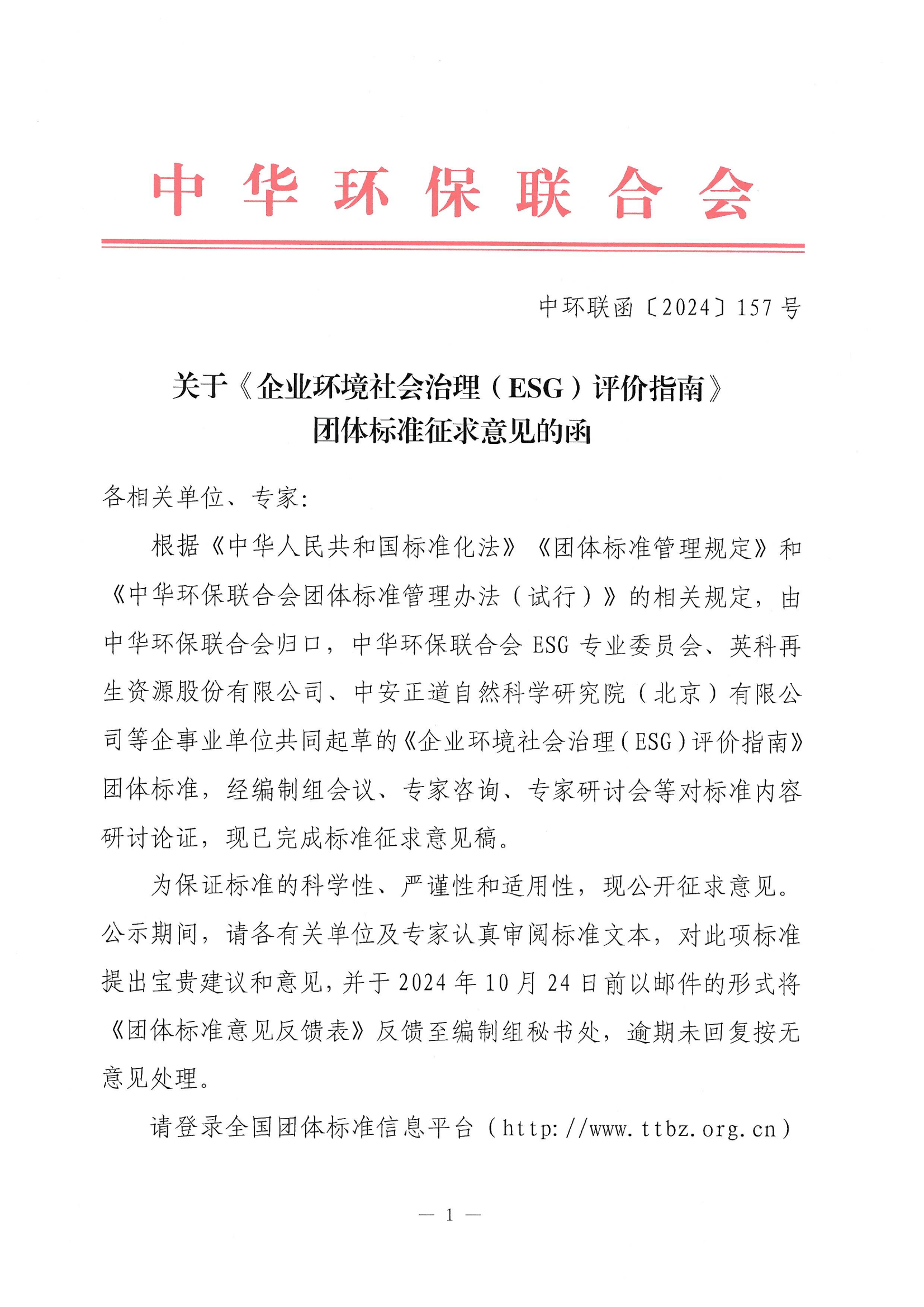 关于《企业环境社会治理(ESG)评价指南》 团体标准征求意见的函