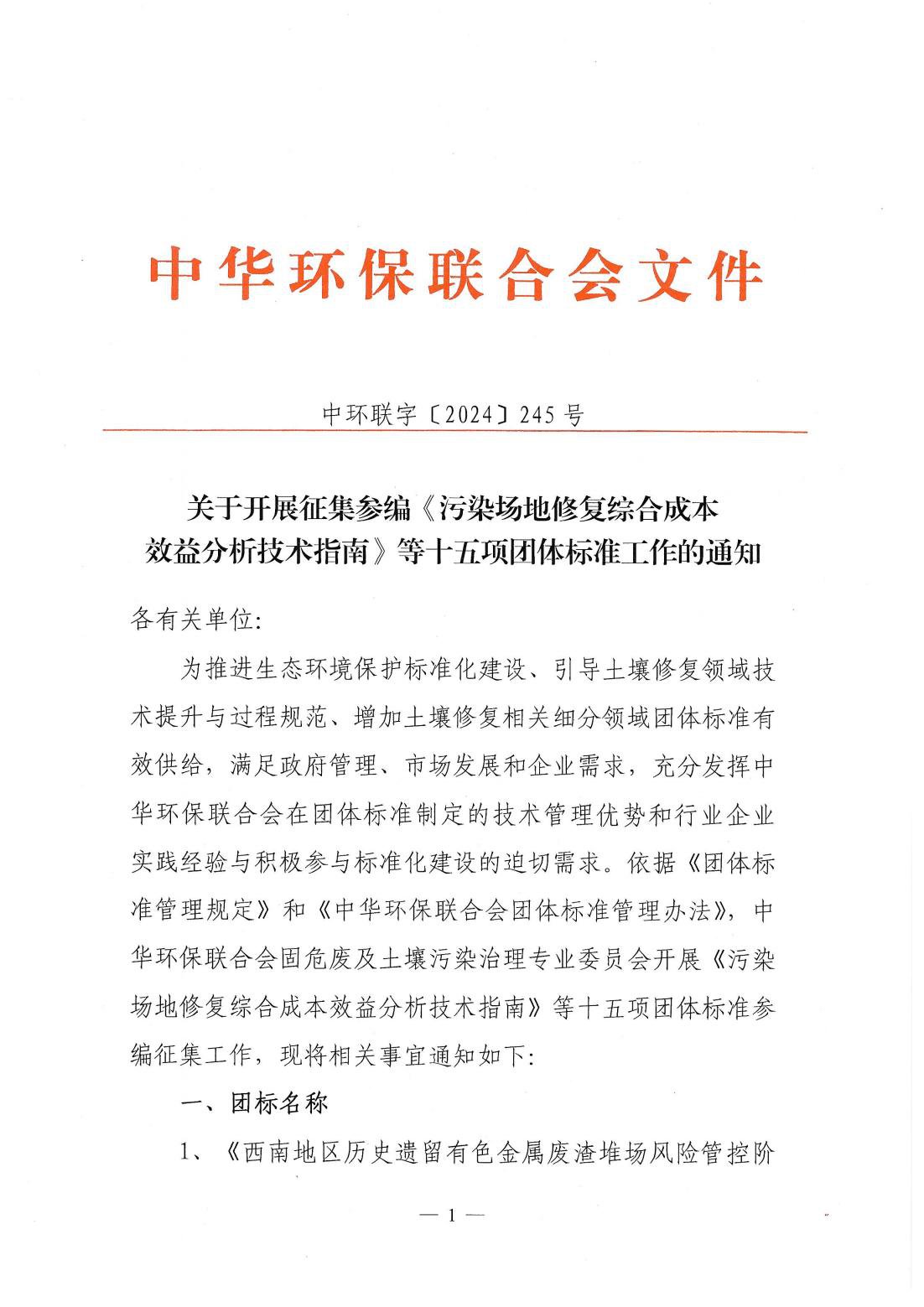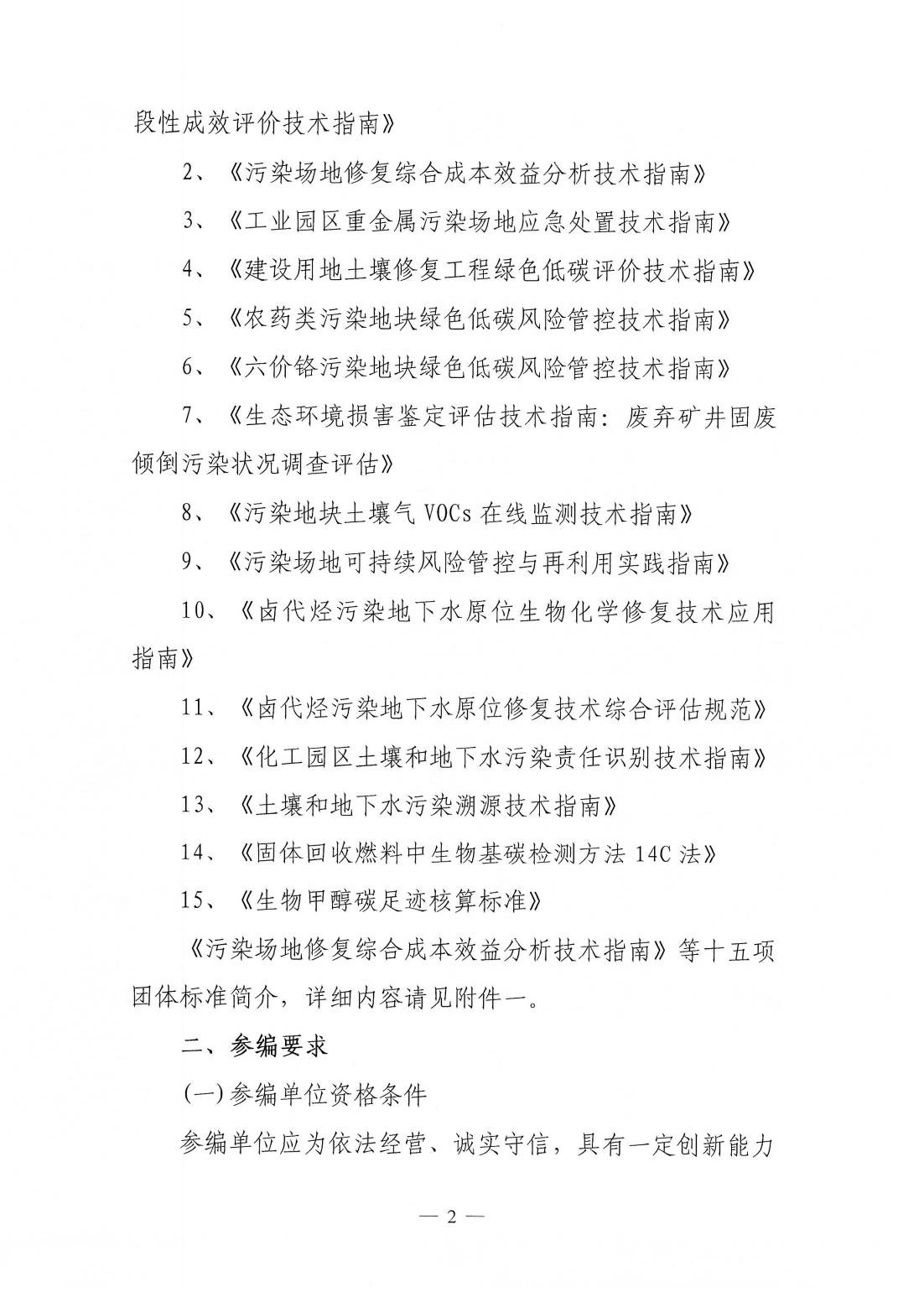 关于开展征集参编《污染场地修复综合成本效益分析技术指南》等十五项团体标准工作的通知