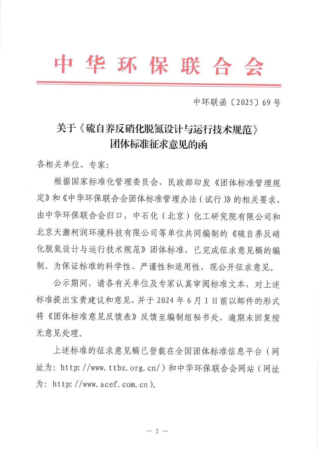 关于《硫自养反硝化脱氮设计与运行技术规范》团体标准征求意见的函