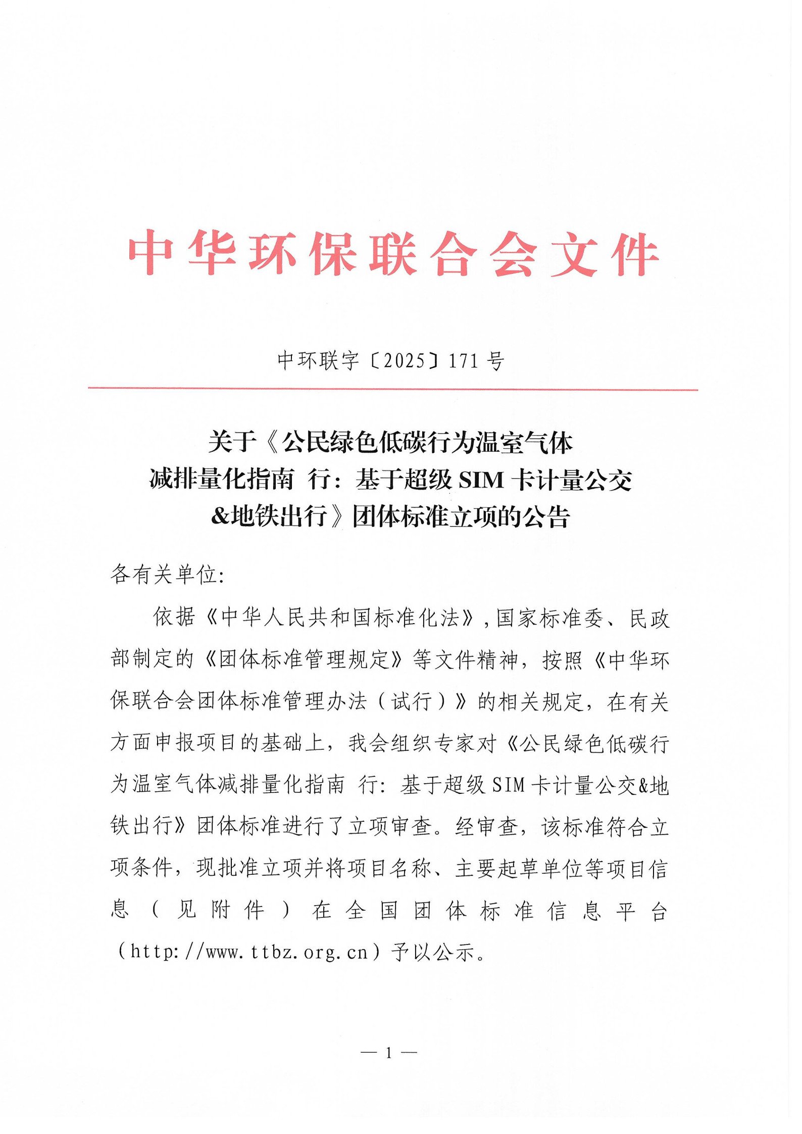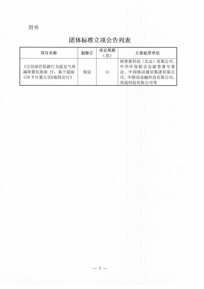 关于《公民绿色低碳行为温室气体减排量化指南 行:基于超级SIM卡计量公交&地铁出行》团体标准立项的公告