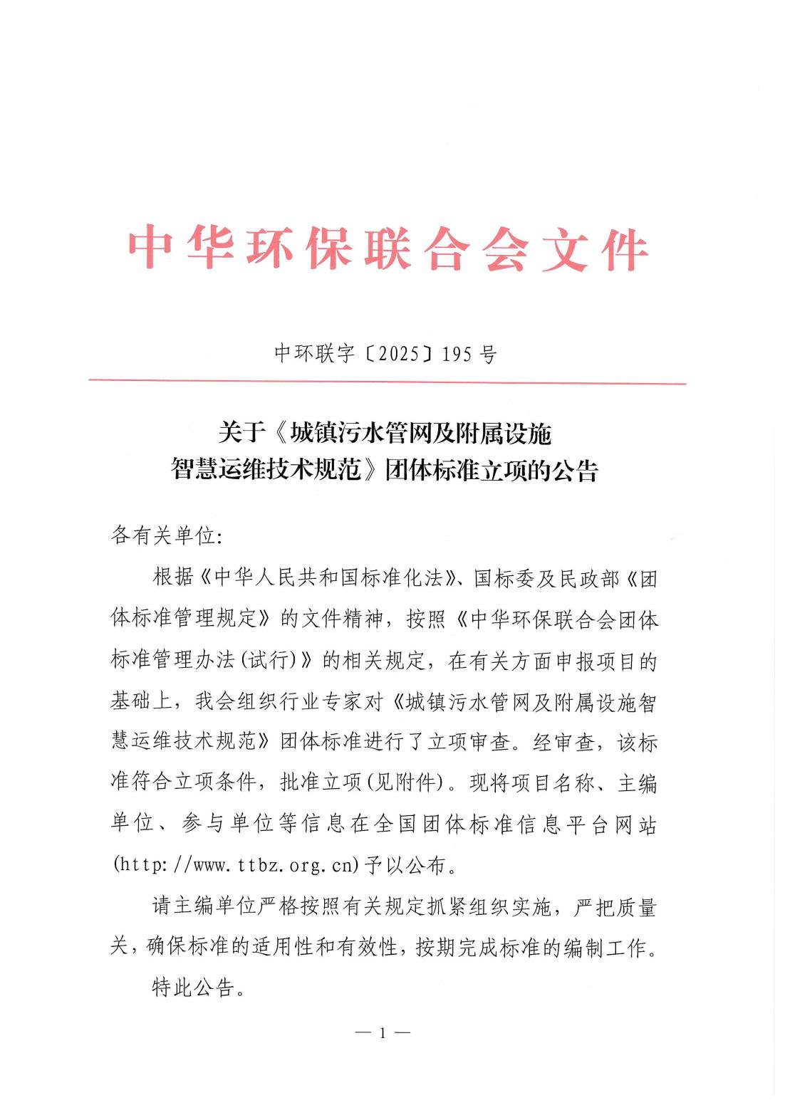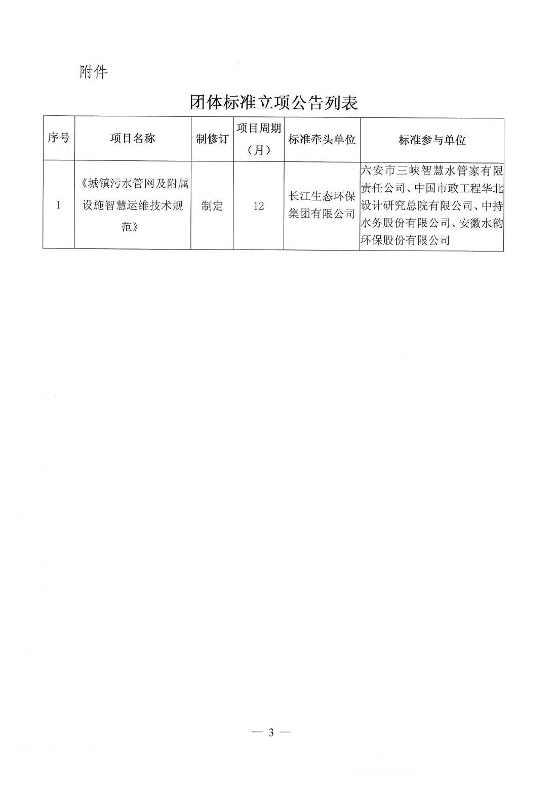 关于《城镇污水管网及附属设施智慧运维技术规范》团体标准立项的公告