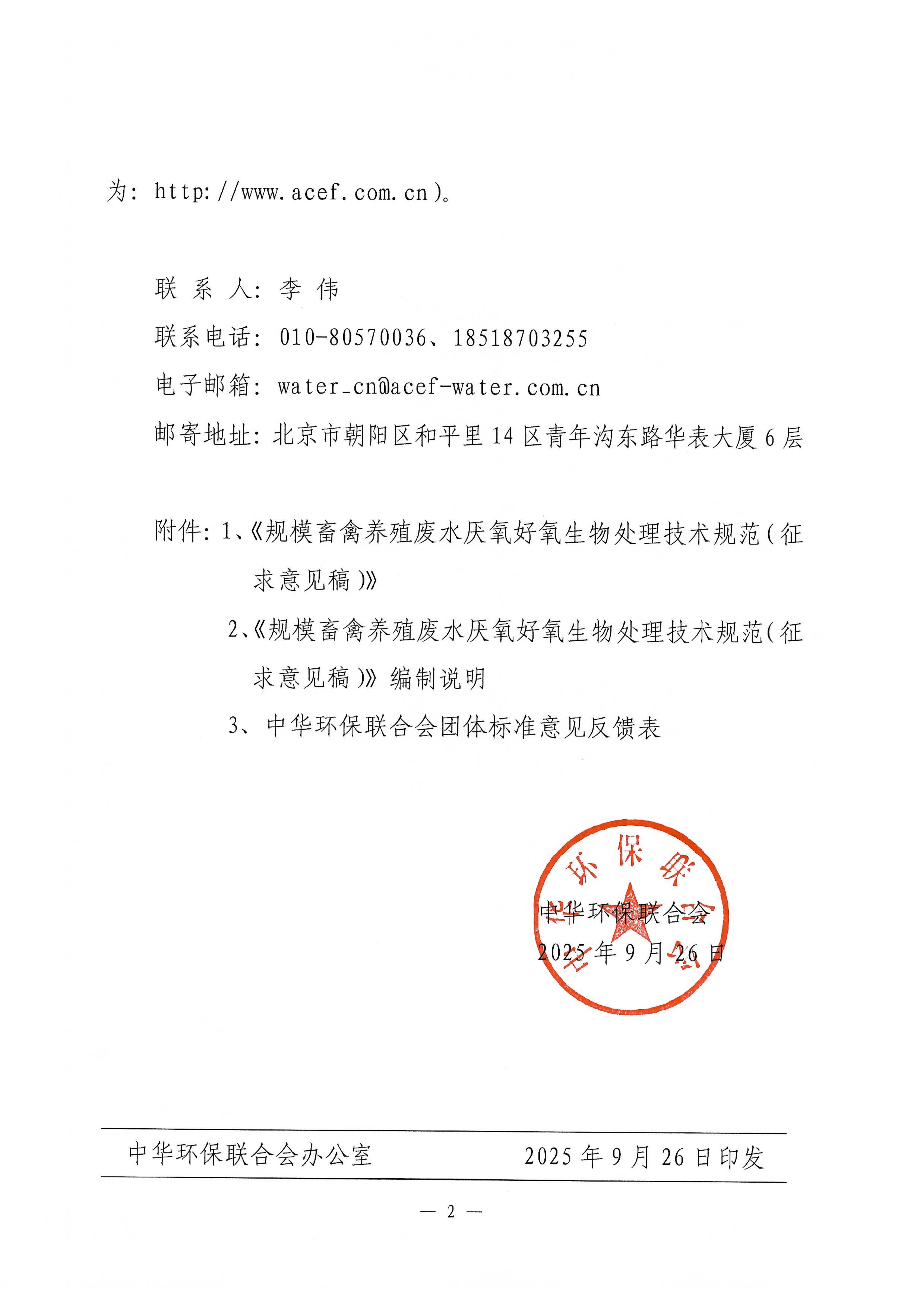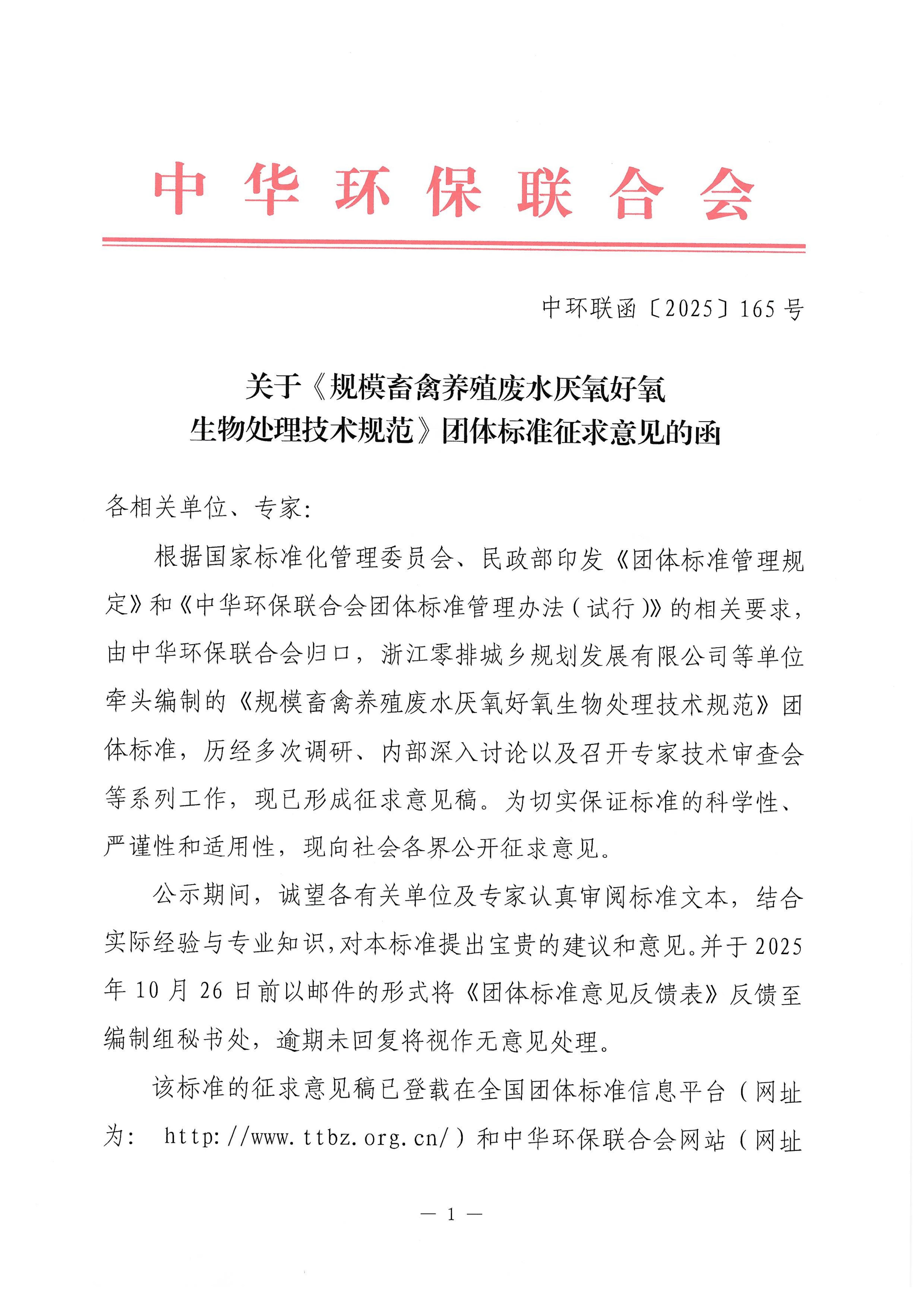 关于《规模畜禽养殖废水厌氧好氧生物处理技术规范》团体标准征求意见的函