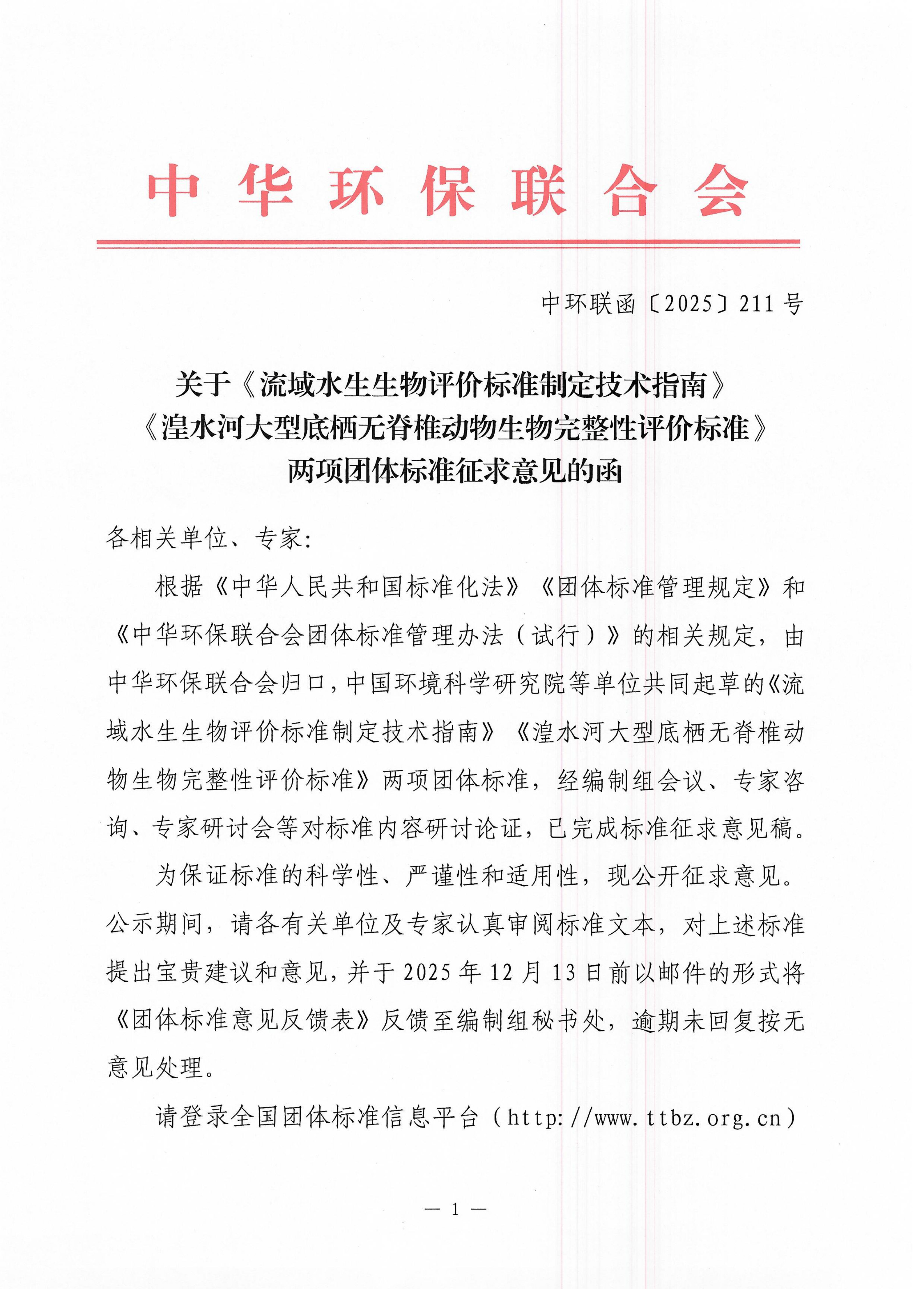 关于《流域水生生物评价标准制定技术指南》《湟水河大型底栖无脊椎动物生物完整性评价标准》两项团体标准征求意见的函 |