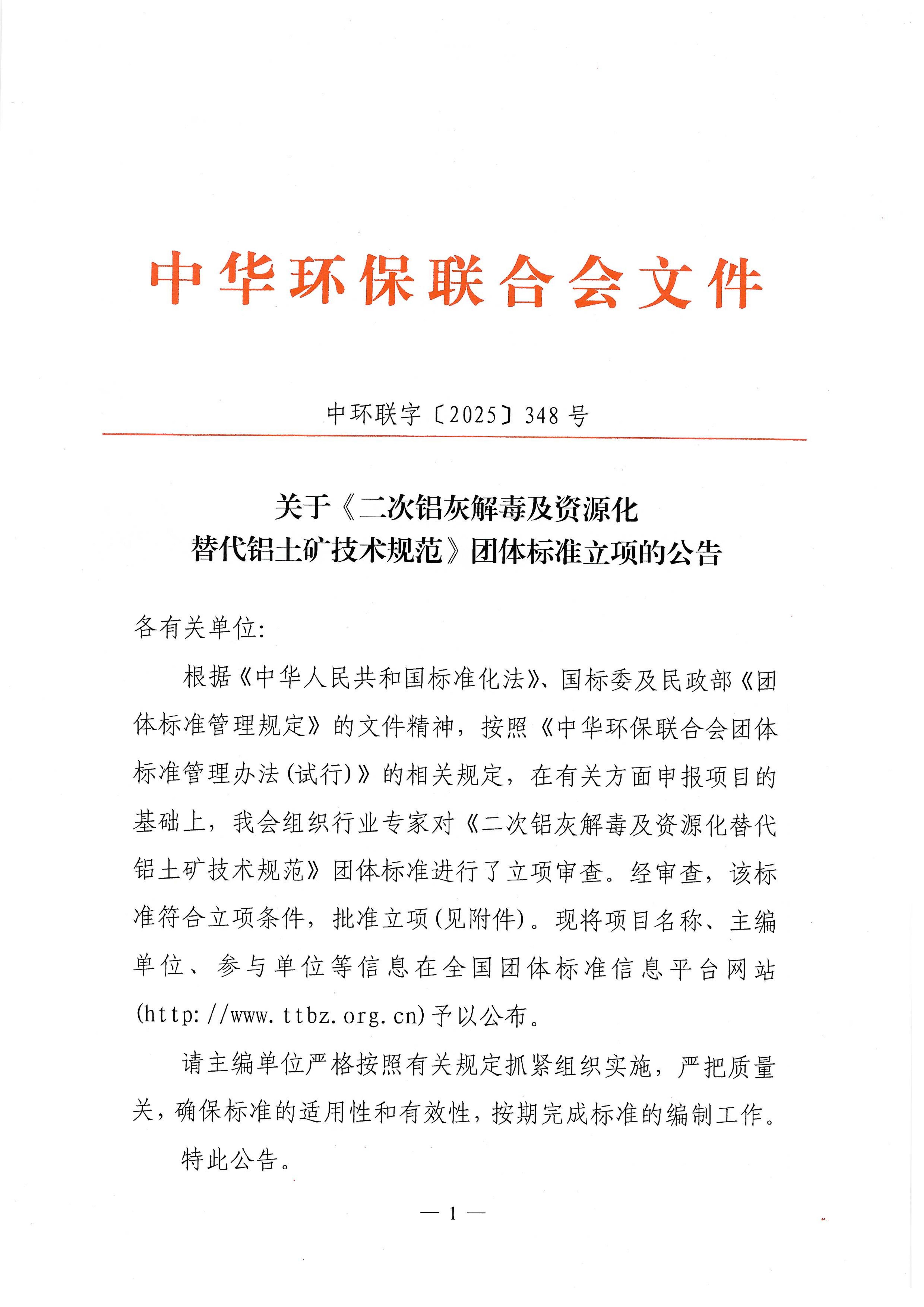 关于《二次铝灰解毒及资源化替代铝土矿技术规范》团体标准立项的公告