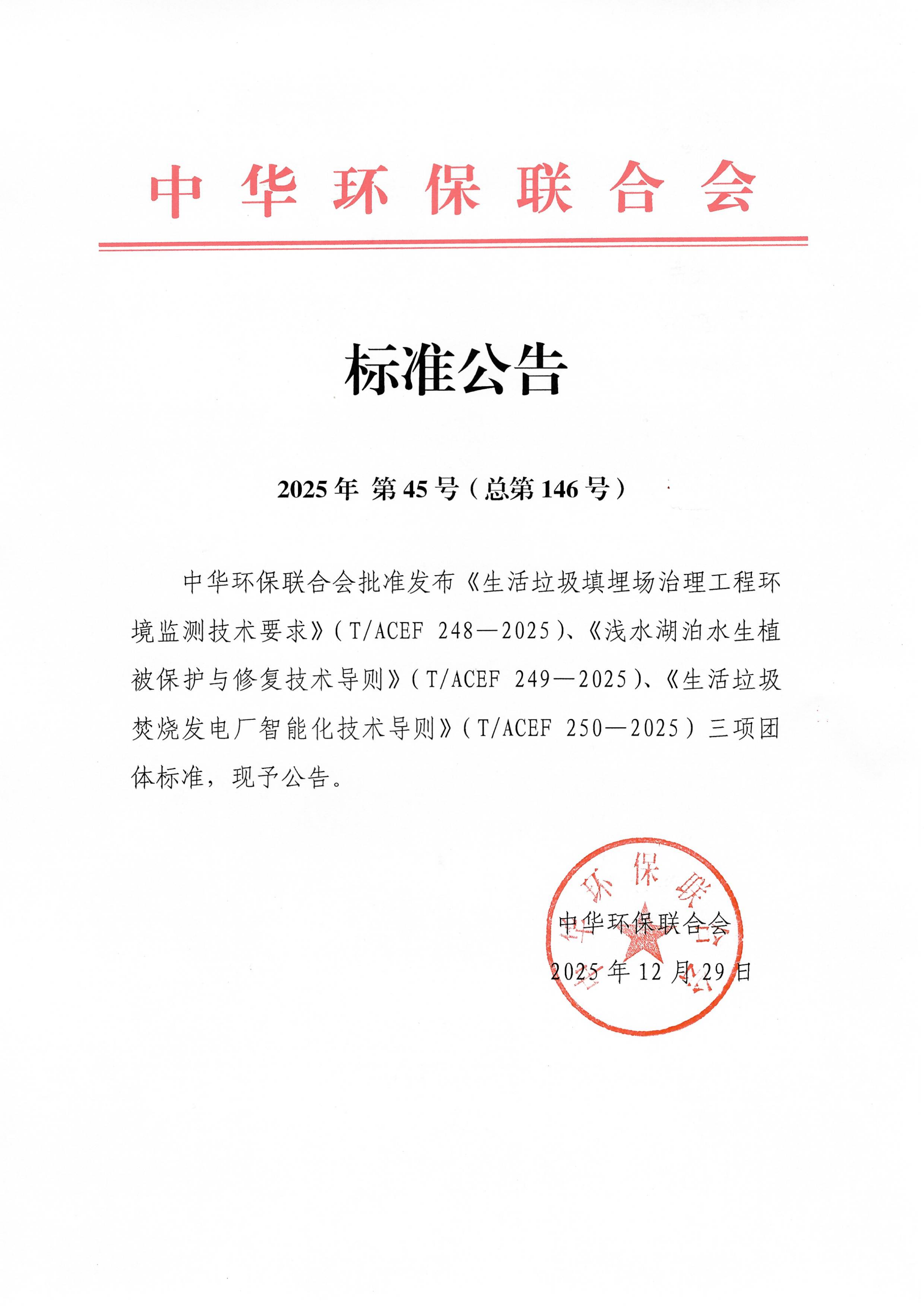 中华环保联合会批准发布《生活垃圾填埋场治理工程环境监测技术要求》等三项团体标准的公告