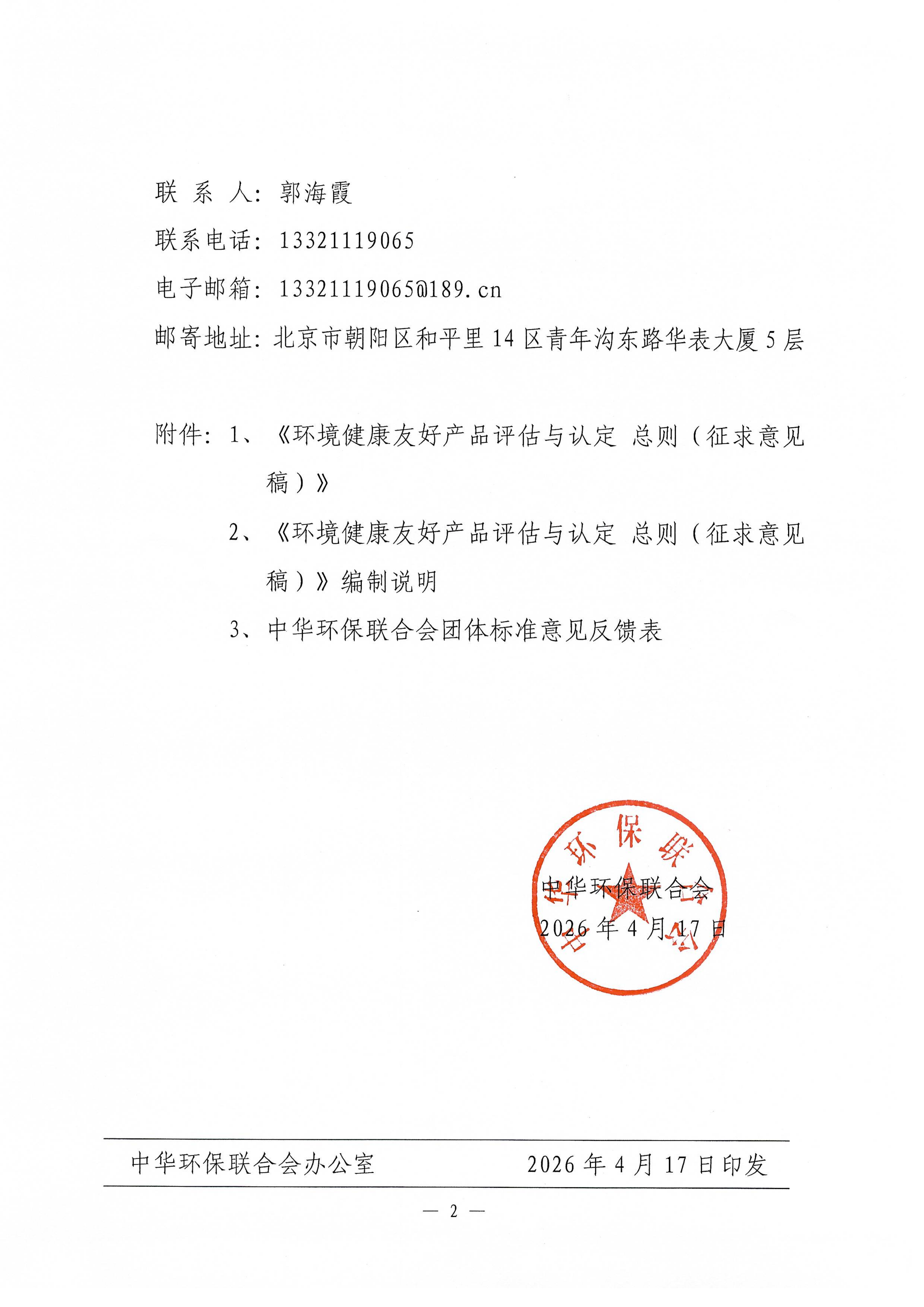 关于《环境健康友好产品评估与认定 总则》团体标准征求意见的函
