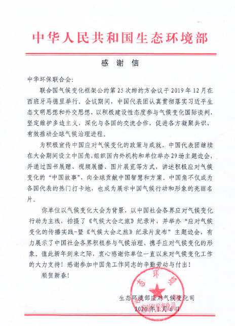 2020年1月,生态环境部应对气候变化司向我会发来感谢信,对我会在联合国气候变化框架公约第25次缔约方会议期间,围绕2019年度我会出品的《气候大会之旅》纪录片积极组织对话交流活动,充分展示中国社会各界积极参与气候治理、携手应对气候变化的形象表示感谢。在相关机构的支持下,联合会拟继续完成《气候大会之旅》后两集的制作工作,全面讲述气候公约进程,展示中国民间气候行动。