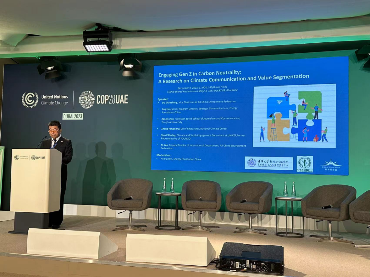 围绕当前全球关注的Z世代(1995~2009年出生人群)的气候传播问题,与能源基金会、清华大学新闻与传播学院于COP28官方发布区联合主办了主题发布活动。中华环保联合会副主席杜少中做开场致辞,清华大学新闻传播学院教授曾繁旭分享了最新的人群价值分析与气候叙事方式的研究成果,随后来自中国气象局、中华环保联合会、联合国气候变化公约青年代表团(UNFCCC YOUNGO)的代表,与能源基金会代表围绕青年气候传播的要点和策略进行了研讨。