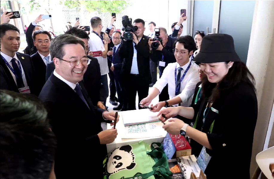 中共中央政治局常委、国务院副总理丁薛祥在“中国角”展台及活动区,了解中华环保联合会团队参与设计制作的可持续纪念品、熊猫主题雕塑和玩偶。