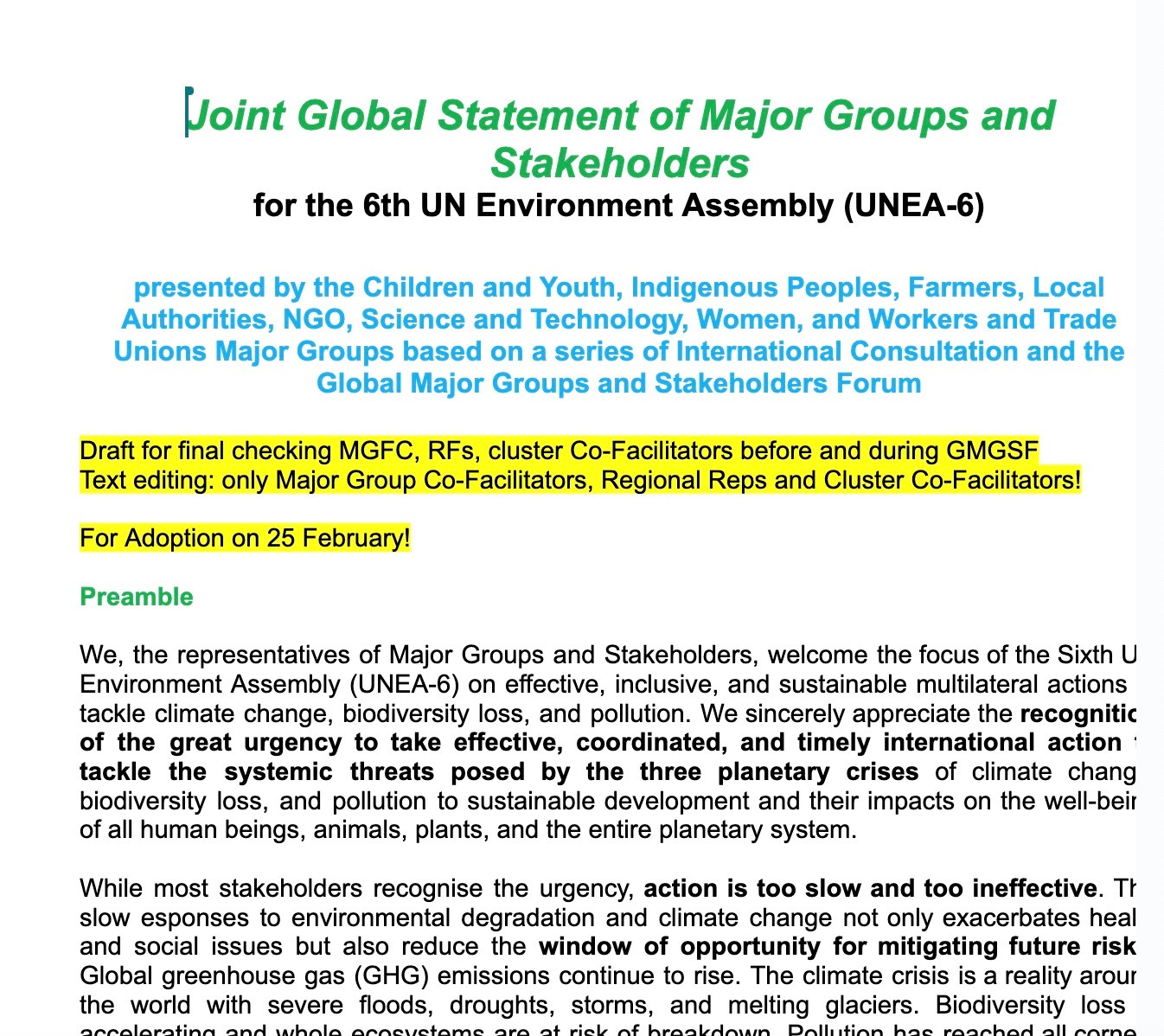 图2 经多轮意见征集和现场研讨,会议最终形成了全球民间组织立场书并提交大会秘书处。上图为正在修订中的版本。