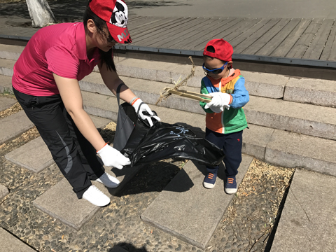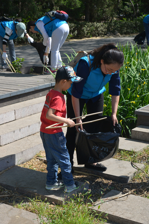 妈妈带着小朋友一起清理河道