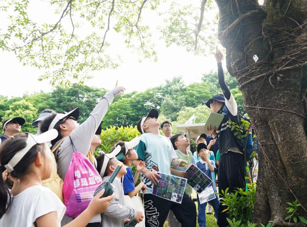 从关山月美术馆出发,沿着莲花山公园绿道行进,被绿色紧密包围着的大小朋友们兴奋不已。边走边看边学,监测中心站工作人员结合实景介绍着公园内的动植物,手拿动植物图鉴卡的小朋友们认真对照着,一路上飘荡着十万个为什么。当发现少见的变色树蜥时,大家争相抬头看向树梢,眼中满是好奇,工作人员也趁机科普深圳生物多样性现状。