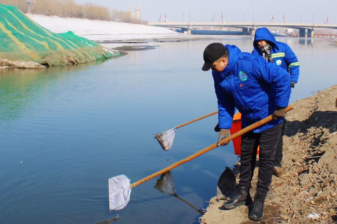 现场室外温度虽然已经维持在零摄氏度左右,但是春风刺骨,不到十分钟,志愿者们的脸部、手部都已经冻得通红,“我们今天有35名志愿者参与活动,从工作到志愿,都是围绕环保公益践行志愿者责任,从动态巡视维护到今天的母亲河保护,俯下身从小事做起,人人争做环保卫士。”哈尔滨市城市内河建设发展有限公司志愿者服务队龚欣表示。