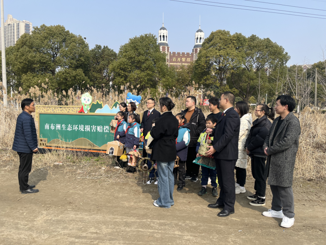 南布洲生态环境损害赔偿修复基地与长江饮用水水源地保护区相邻,结合沿江生态景观带建设同步实施,总规划面积5.3公顷,其中林地3.3公顷、水面两公顷。项目一期已种植林地面积约1.2公顷,种植水杉600棵和榉树100棵。该生态修复基地集“生态修复、警示教育、普法宣传、劳动代偿”于一体,将长江岸线造林绿化、生物多样性保护、生态文明理念宣传与城市环境提升有机结合。