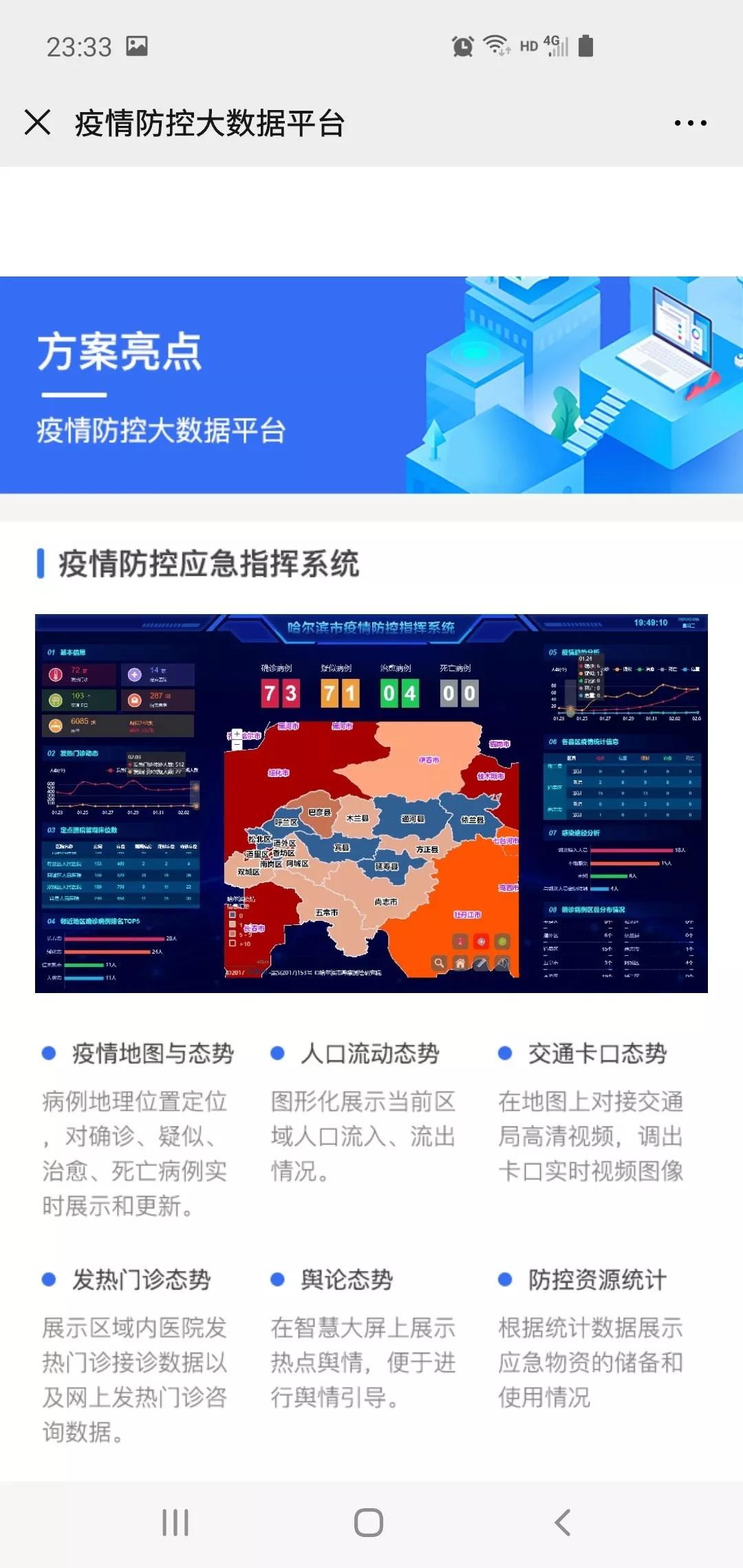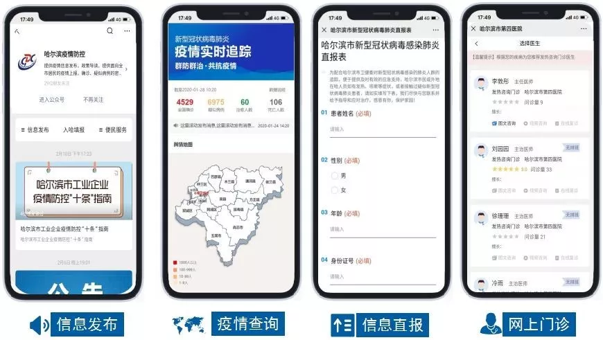 截至2月16日,“哈尔滨疫情防控”公众号进行了四次版本迭代,目前开放了三大类11项功能,其中网上问诊平台已入驻6家省属医院,24家市、区属医院,涵盖了互联网医院、发热门诊咨询、心理咨询、专科诊疗咨询等多种医疗服务;疫情防控用品预约购买服务累计预约数十万瓶消毒酒精;“入哈登记”应用自上线以来所有来哈人员在机场、车站均通过此功能进行入哈申报,目前公安、疾控、街道、社区,均以此系统中的数据作为疫情防控、居家隔离、流行病学调查的依据,该系统为疫情防控做出极大的贡献。