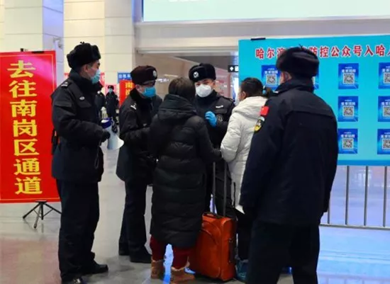 哈尔滨机场工作人员指导旅客填报“入哈登记”