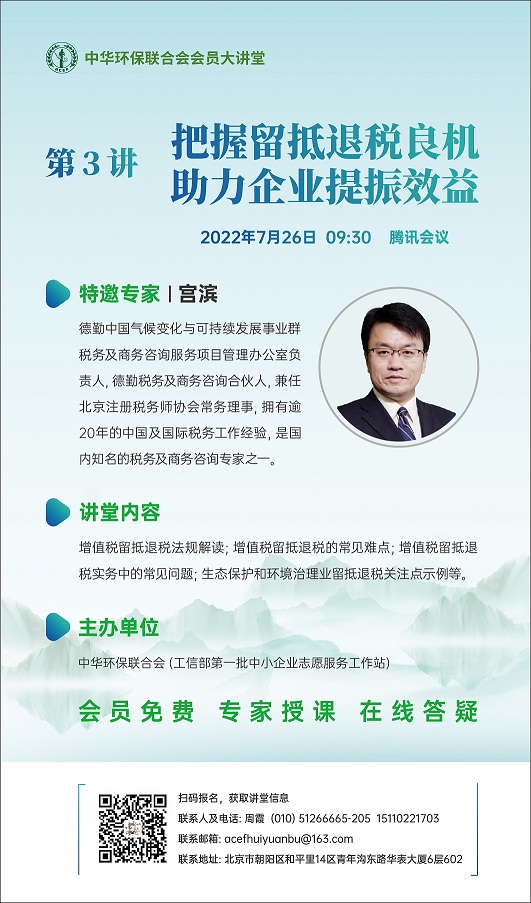 为更好的服务于会员企业,进一步搭建会员企业沟通交流的平台,助力会员企业发展,发挥中华环保联合会作为工信部第一批中小企业志愿服务工作站的作用,7月26日09:30,以线上视频形式(腾讯会议)举办“中华环保联合会会员大讲堂”第三讲。