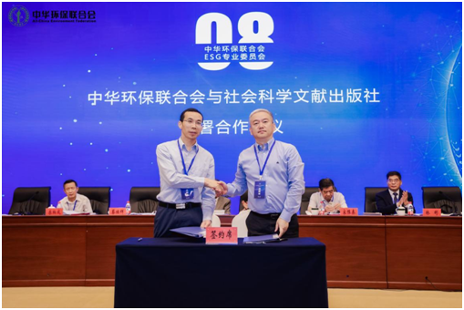会议期间,中华环保联合会ESG专业委员会常务副主任王晓光,社会科学文献出版社副总编辑、皮书研究院院长蔡继辉作为双方代表,在各位领导和嘉宾的见证下签署了共同编写出版发布国内首部“企业ESG蓝皮书”战略合作协议。