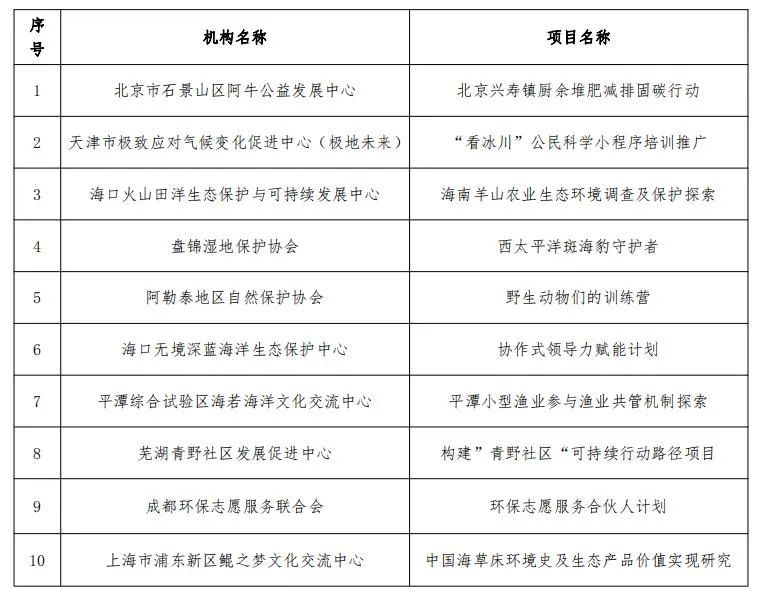 环境公益“新”力量项目(以下简称新力量项目)自2023年6月正式发布后,共收到来自24个省49个城市的73份申报材料。在经过合规审查、初试书面评分和复试视频答辩三个评审环节后,7名业内知名专家最终通过评分和合议,确定了10家新力量项目获选机构,现将名单公示如下: