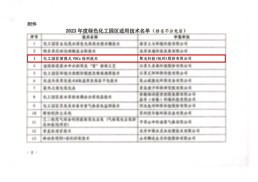 为落实《国家发展改革委 工业和信息化部关于促进石化产业绿色发展的指导意见》(发改产业〔2017〕2105号)文件精神,做好绿色化工园区建设技术支撑,中国石油和化学工业联合会化工园区工作委员会组织开展“2023年绿色化工园区适用技术”申报工作,聚光科技(杭州)股份有限公司(以下简称“聚光科技”)申报的化工园区便携式VOCs检测技术通过评审成功入选。